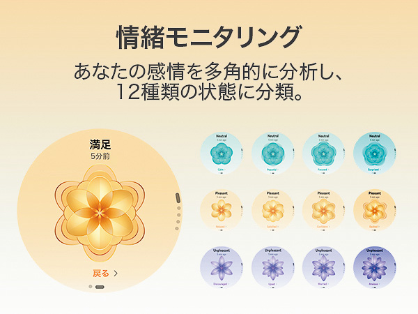 ▲心拍や体表温度などから感情を多角的に測定し、12種類の状態に分類。自分の心身状態を客観視することが可能だ
