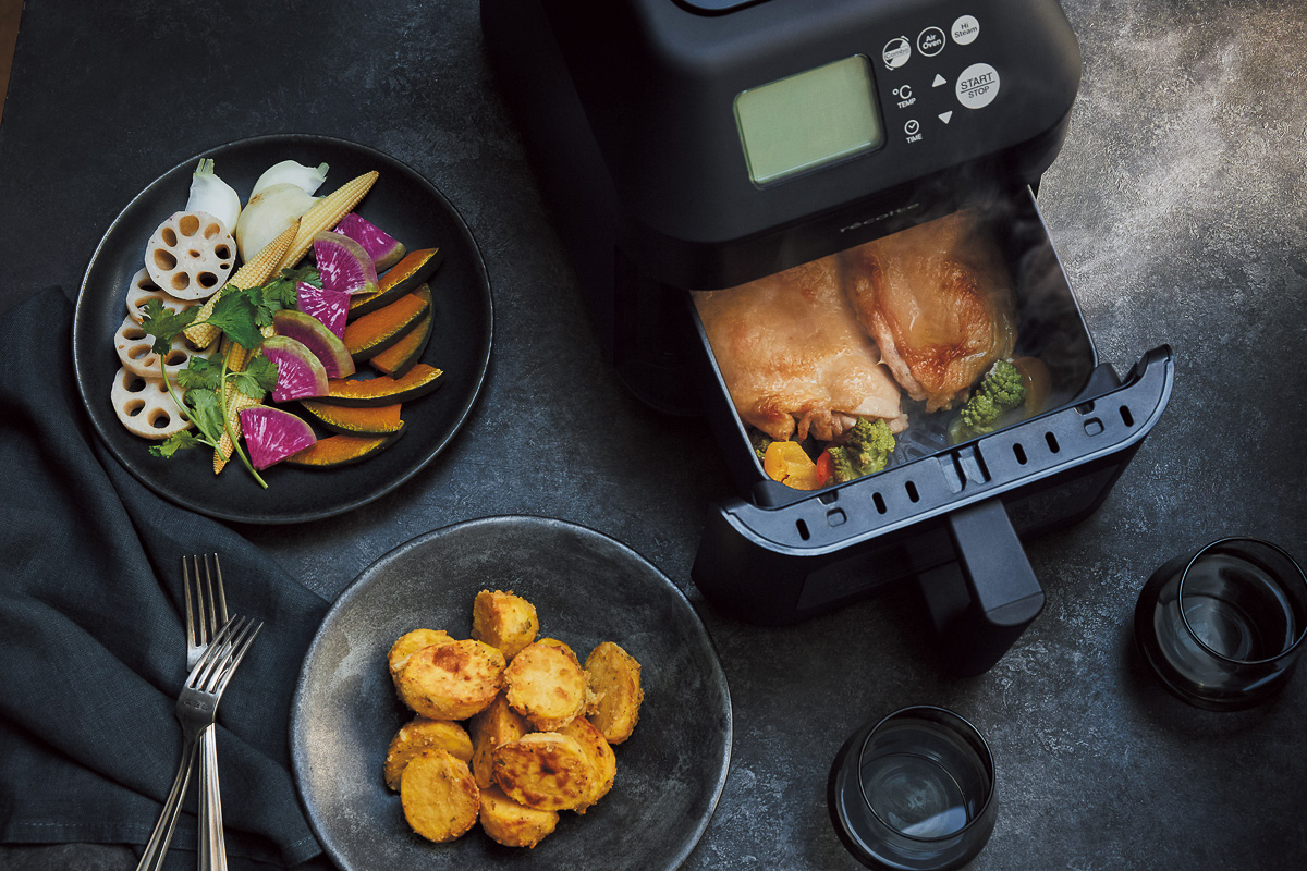 熱風で加熱するノンフライ調理機能に加え、大量の蒸気と高温の熱風を循環させるハイスチームモードを搭載。食材の水分を保ちながら加熱することで、手軽に仕上がりの質を高められる。ハンバーグや煮付け、ケーキなど、一台で料理の幅が広がる。