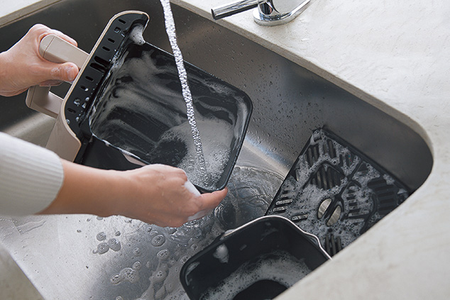 ▲引き出し式バスケットは取り外して丸洗い可能。蒸気で油汚れを浮かせるモードも搭載