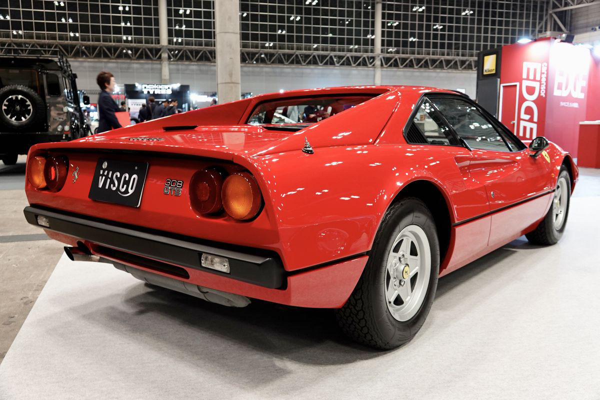 搭載エンジンは3L V型8気筒で、最高出力255ps、最大トルク30.0kg-mを発揮。車名の308は3L V8エンジン搭載に由来します。初期モデルはマフラーがシングルパイプになります。308は筆者が某誌の編集部員だった頃に同僚が無理をして購入。当時の価格は400万円を切っていました。展示車両の価格は3740万円。30年で価格が10倍にもなったのかと驚きました。