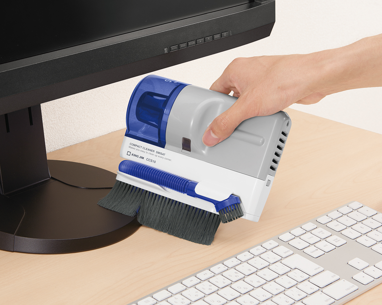 でもキングジムの小型掃除機「スミサット」があれば、仕事の合間にちょっとゴミ取りやホコリ取りができますよ。
