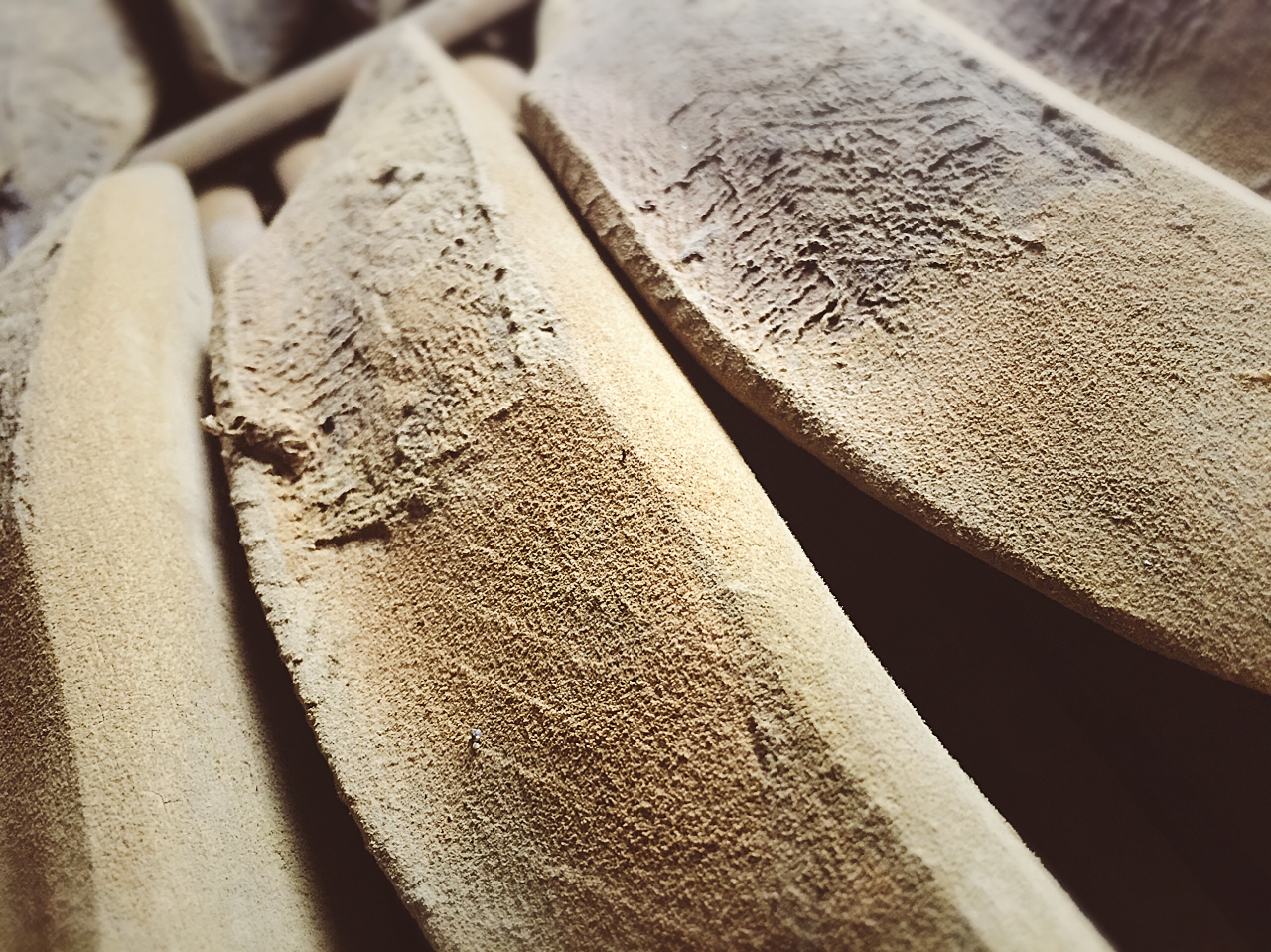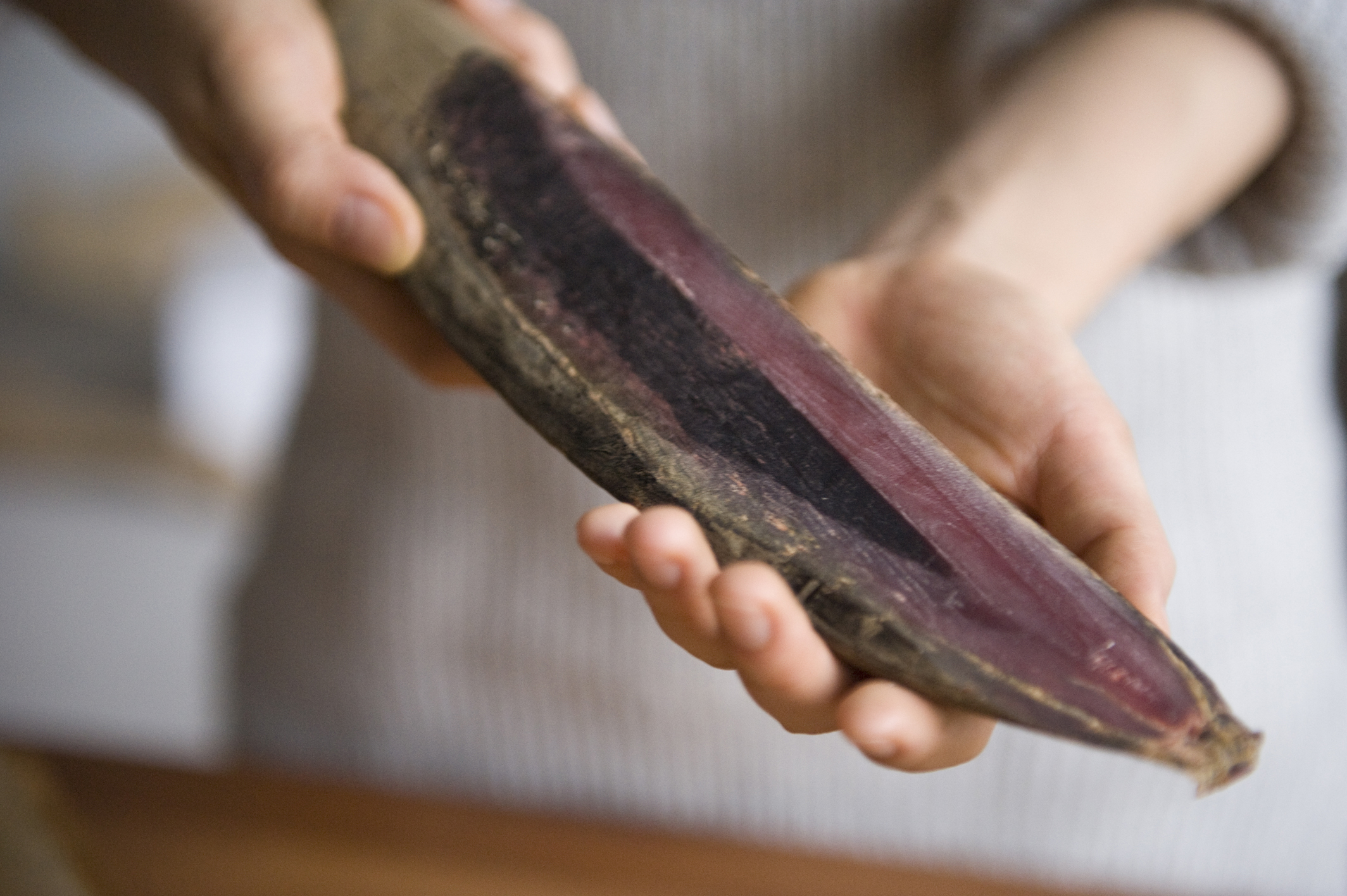 カビのご馳走は水分です。カビは節の表面から中心部に渡り水分を徐々に吸収し、乾燥してくれます。それを繰り返すことで、中の水分量はたったの15%~13%になり、世界で一番硬い食べ物になるのです。この作業は3~5カ月もの歳月を費やします。