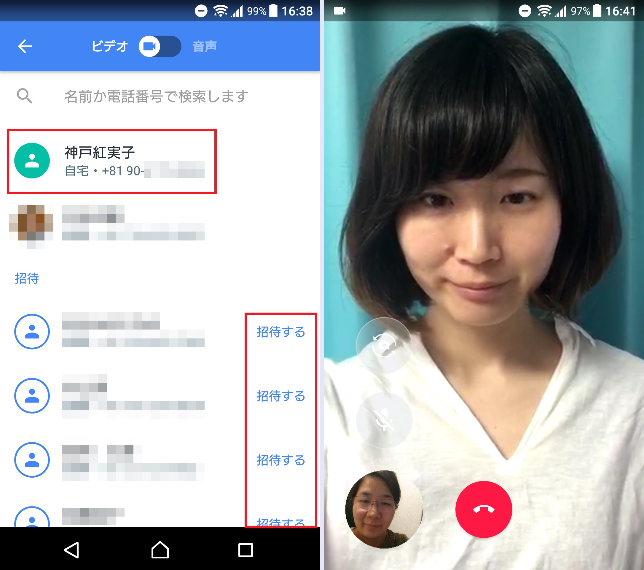 ▲「Google Duo」に登録している人のなかから、電話をかけたい人の名前をタップ(左)。相手とのビデオ通話が開始された(右)