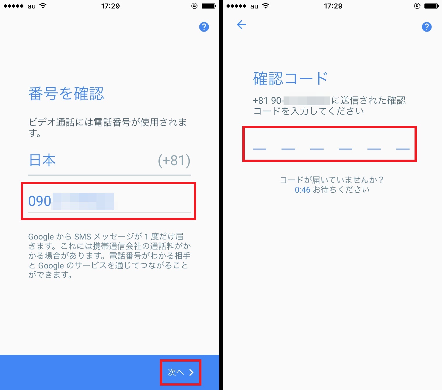 電話番号を確認すると、確認コードが反映されて「Google Duo」の発信画面に切り替わります。電話番号宛てにSMSが届き、コードを確認することができますが、筆者が使ったスマホ(Xperia Z5)では、確認コードを手入力する必要はありませんでした。