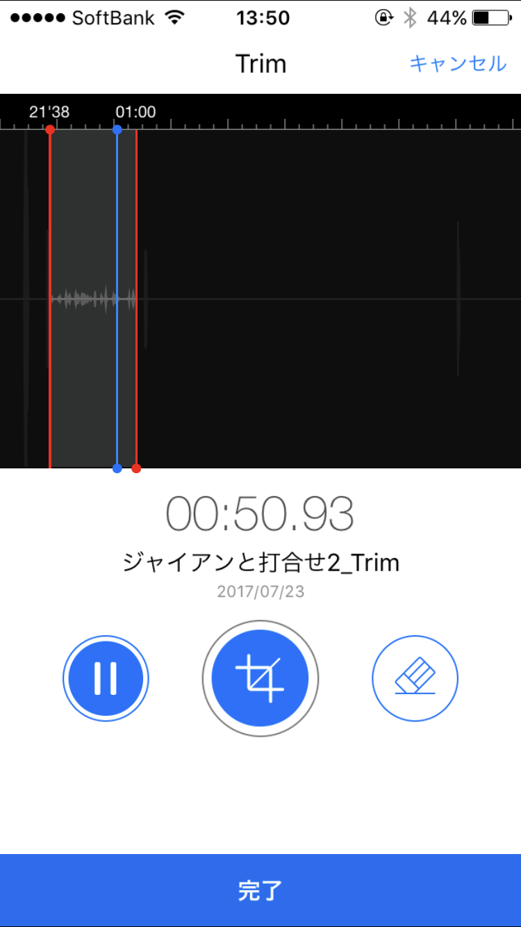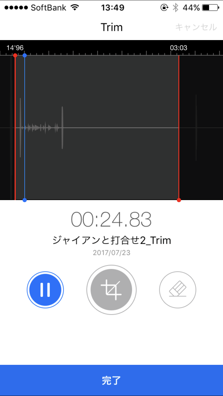 後から、必要なところだけを残すトリミングも可能です。「編集」ボタンを押し、残したい部分だけを残して、その他の部分は消去できます。呼び出し音や時候の挨拶などの会話を除くのに便利です。