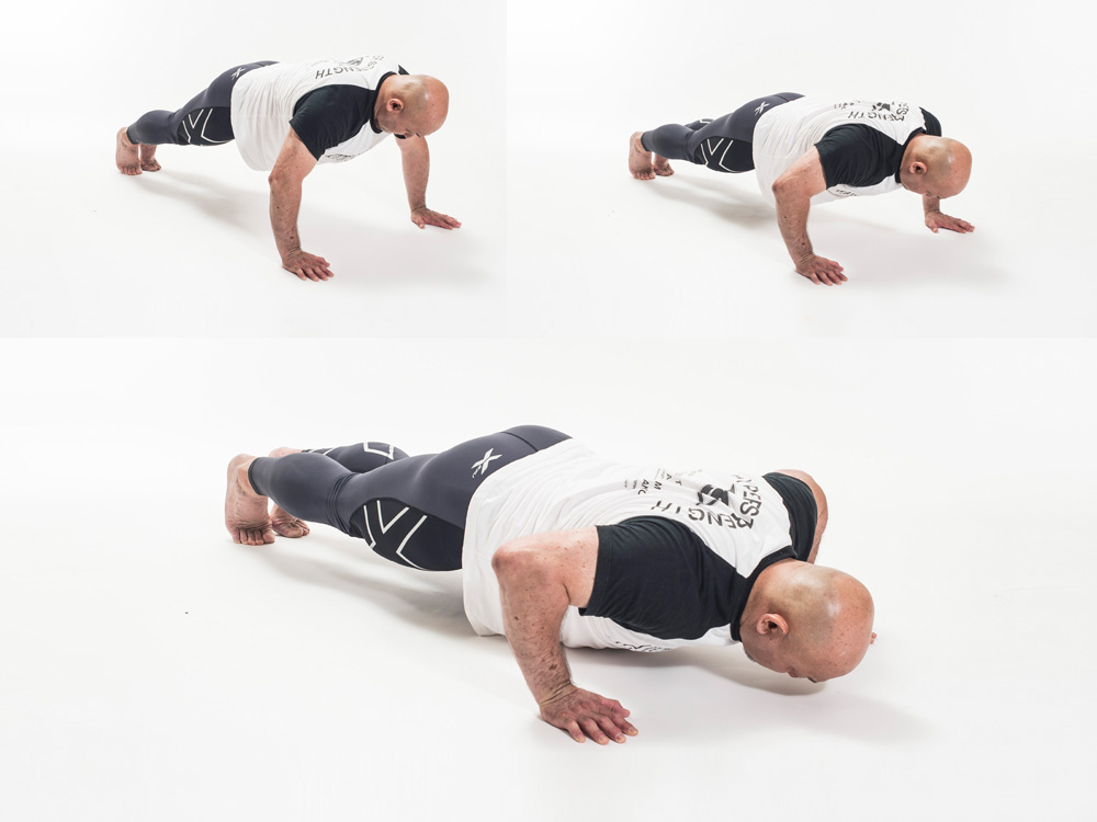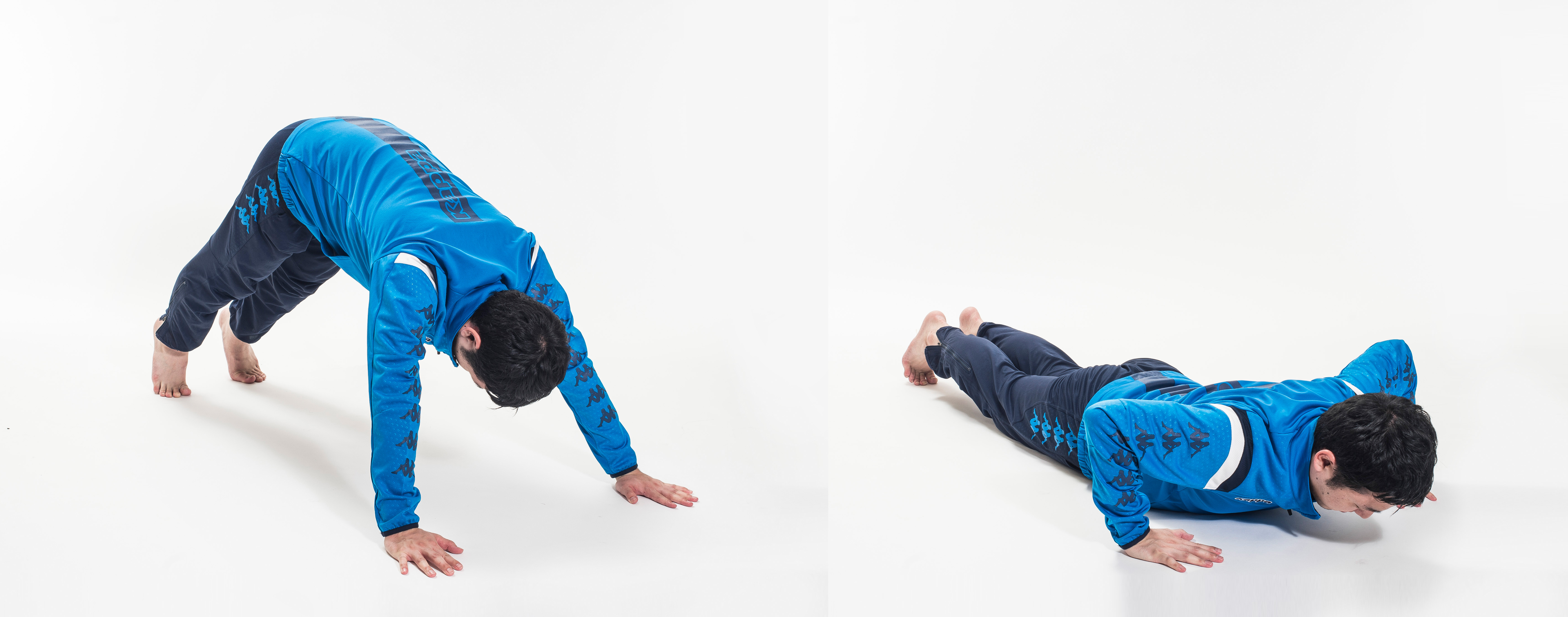 気をつけるのは、最初にバランスをとって身体をまっすぐな姿勢にすること、それと下まで行って戻った時にお尻を上げて身体がくの字に曲がらないようにすること。また下まで行った時は「逆くの字」に身体を反ってお腹を床につけてしまわないように! 普段全然運動していないという人は、最初はちょっとキツいかもしれませんが、やっていればすぐに慣れてきます。