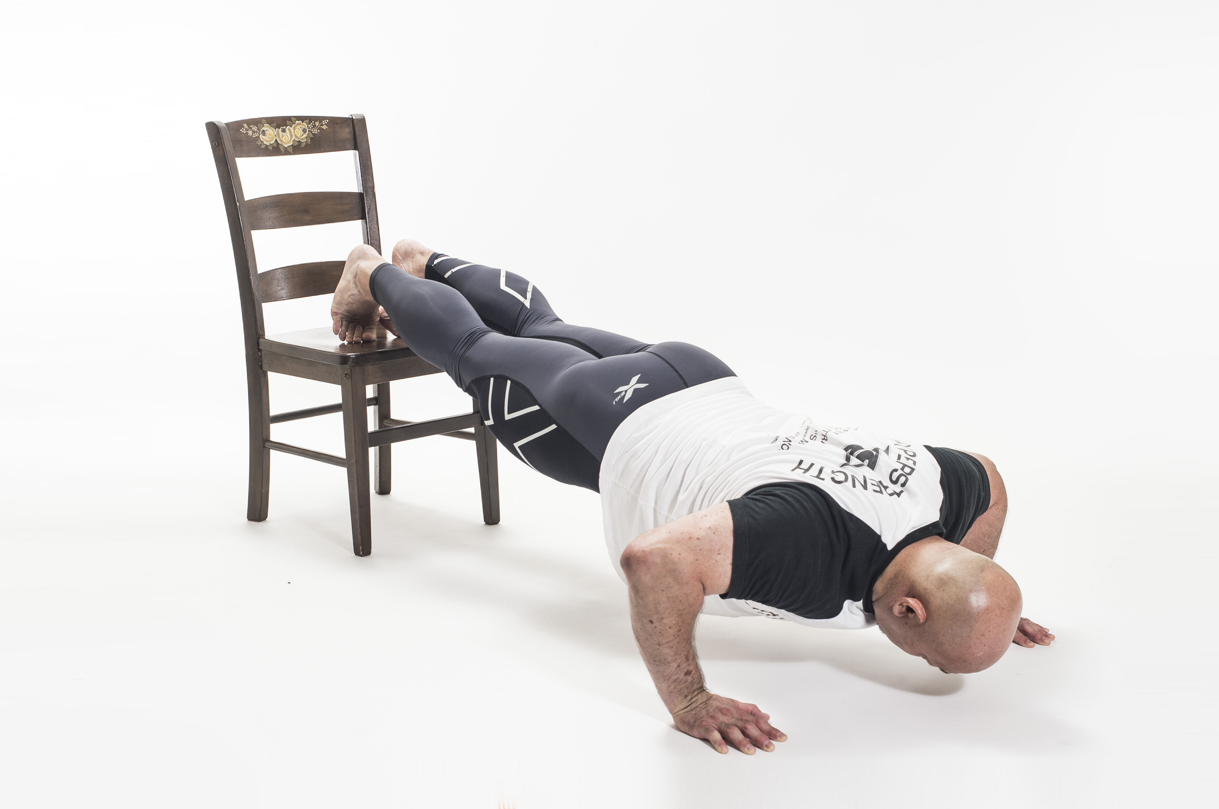 基本的な動きはプッシュアップと同じですが、両足をご家庭にあるイスもしくは台に乗せて、斜めに角度をつけた状態から始めることで負荷がかかるので、効果がアップします。この時も、お尻を上げたり腰を反って体を曲げたりせず、鉄則として身体(体幹)をまっすぐに保って行うように気をつけましょう。足の高さが高いほど傾斜がつくので、負荷が強くなります。低めのオットマンなどがあれば、そこから試してみるのもいいでしょう。