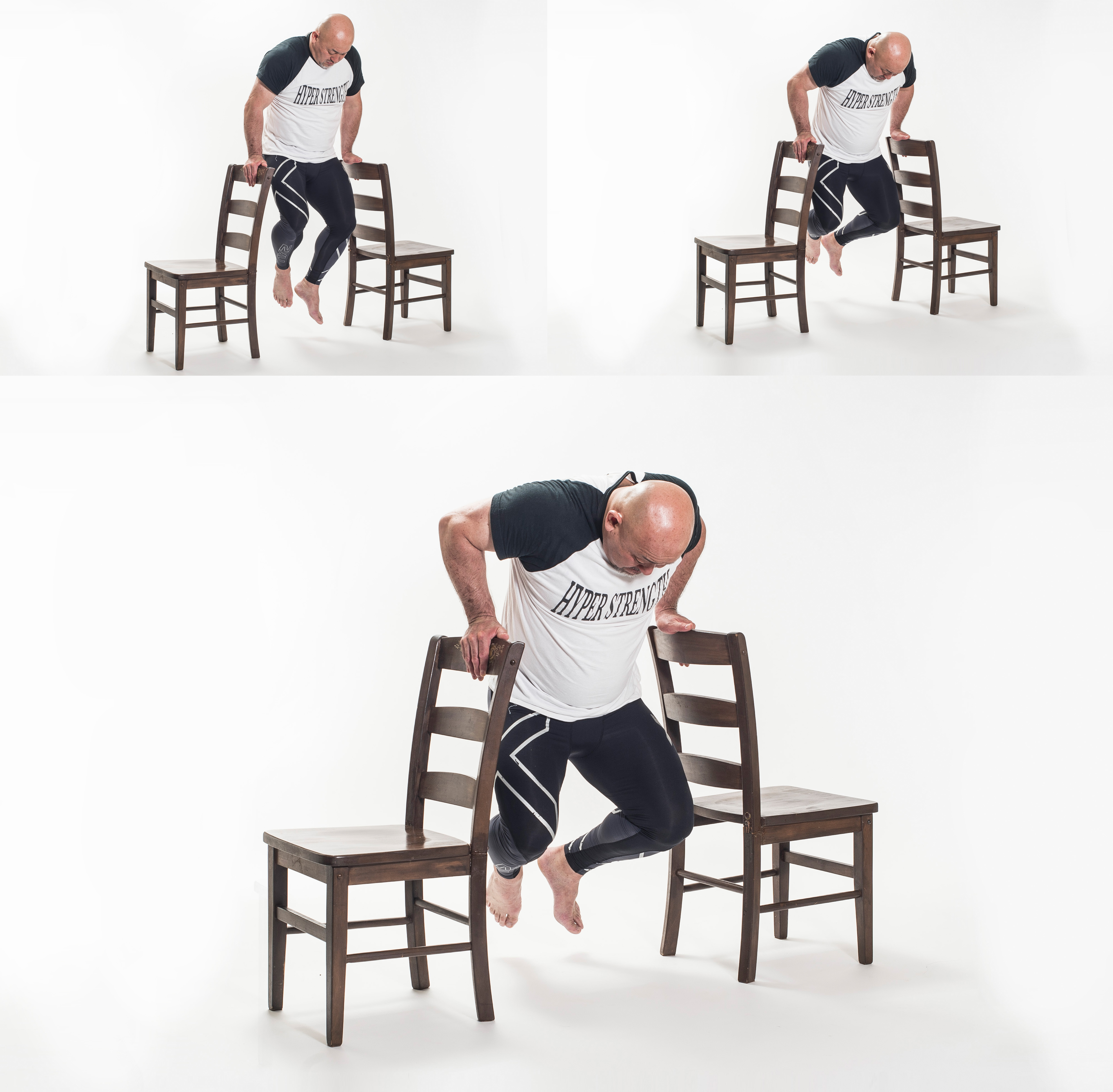 基本動作としては、イスを自分が間に入れるぐらいの間隔で背中合わせに配置し、両方の背もたれを持って体を浮かせます。上半身は少し前傾で。そこからヒジが90度になるまで下ろして静止。足が地面につかないように、ヒザは曲げます。この時も腕の力で下りていくのではなく、胸の筋肉(大胸筋)を使うことを意識し、肩や肩胛骨でバランスを取るようにしましょう。そしてまた元の体勢に戻ります。こちらも、なるべくゆっくり行った方が効果は高くなります。