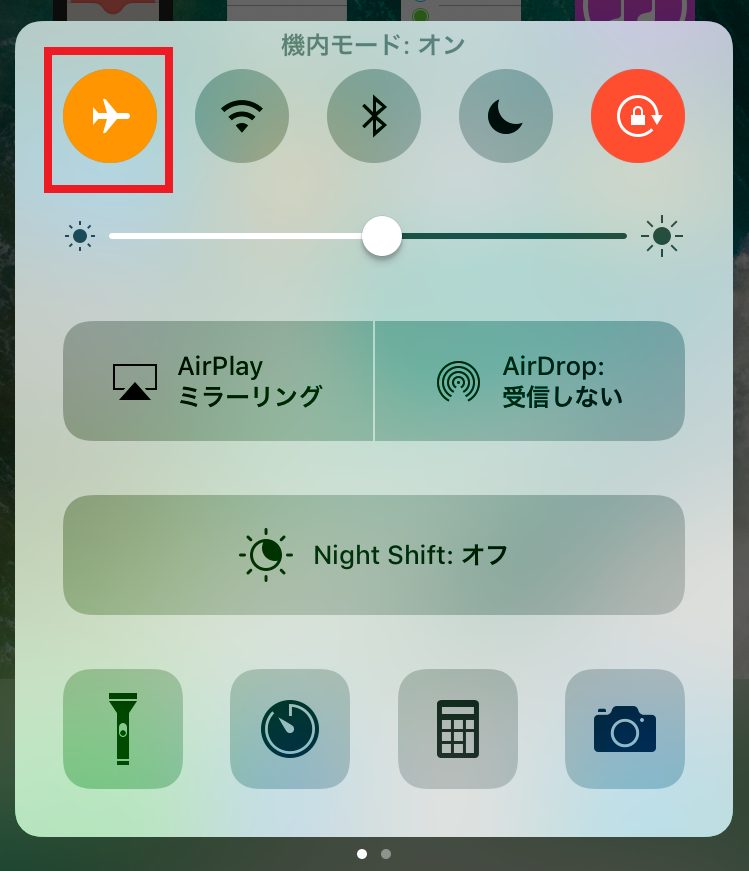 ▲画面を下から上にスワイプし、コントロールセンターを表示する。次に、飛行機のアイコンをタップにする