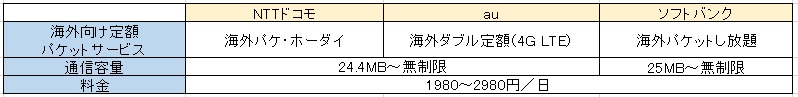 海外でも日本にいるときと同じようにデータ通信をしたい人は、定額サービスがおすすめです。下の表に、最大2980円/日で使い放題になるサービスをまとめました。