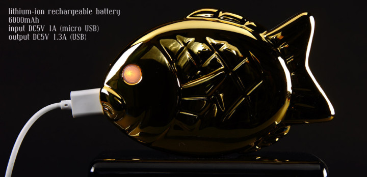 スマホにつながれた姿は、まるで釣られてしまった“たいやき君”。 バッテリーが満タンになると目がピカッと黄色に光ってお知らせしてくれます。容量は6000mAhで、スマホを2〜3回充電できるぐらい。見た目のインパクト重視!という方にぜひ。詳しくはこちら。