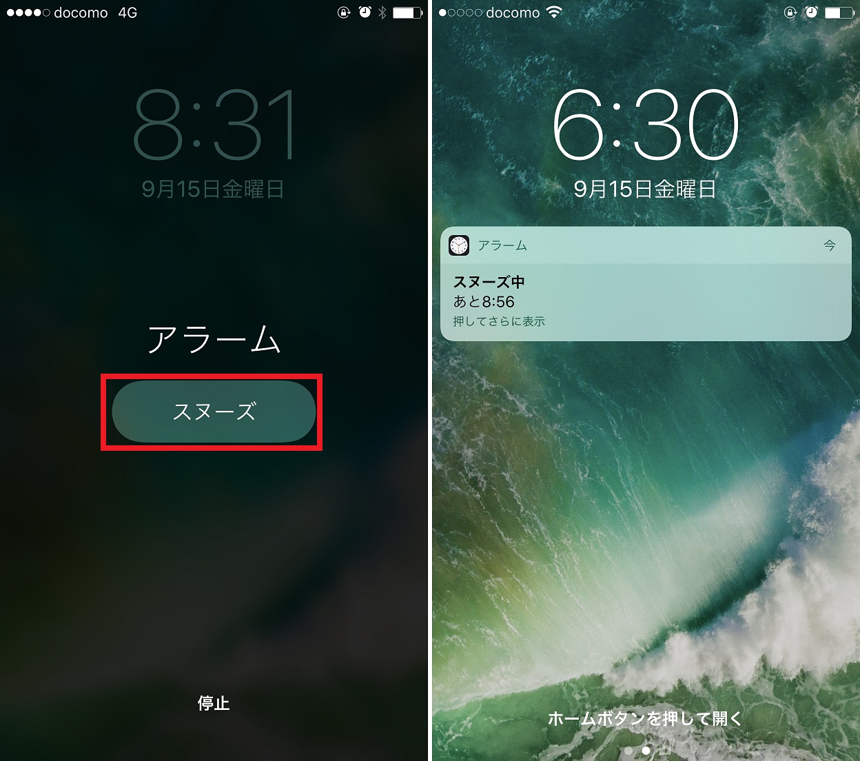 ▲アラーム画面で「スヌーズ」をタップ(左)。次のアラームが鳴るまでの時間がカウントされる(右)