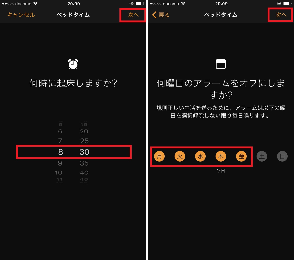▲「時計」アプリを開き、「ベッドタイム」→「開始」の順にタップ。次に、起床時刻を設定し、「次へ」をタップする(左)。アラームが起動する曜日を選択し、「次へ」をタップする(右)