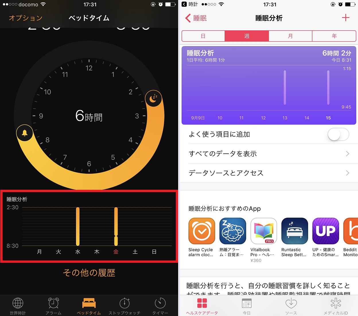 ▲「睡眠分析」に表示された睡眠記録(左)。「ベッドタイム」画面の「睡眠分析」をタップすると、「ヘルスケア」からグラフを見ることができる(右)