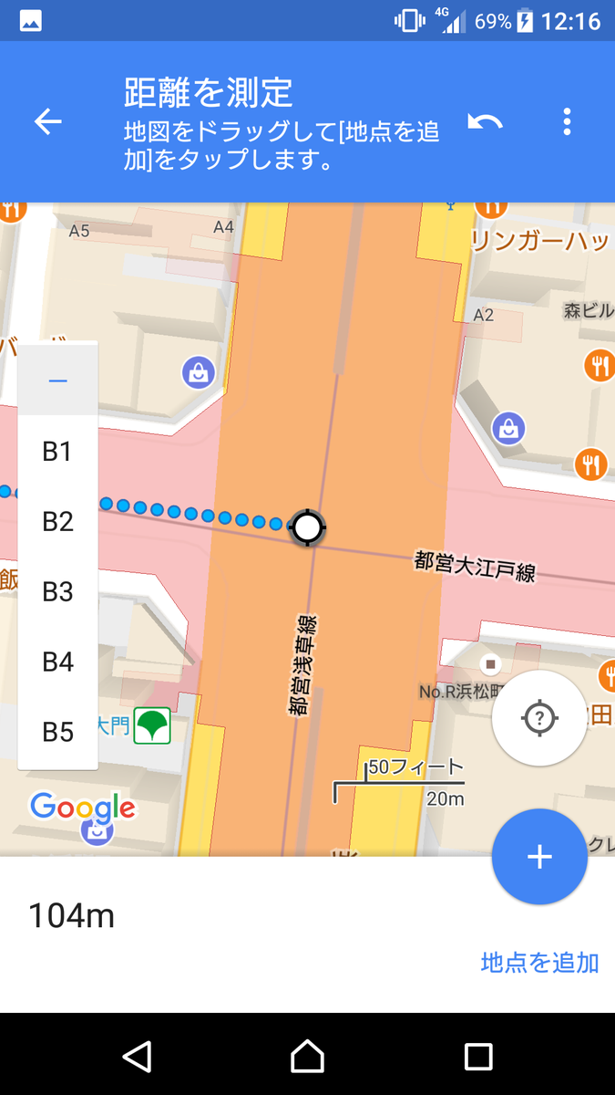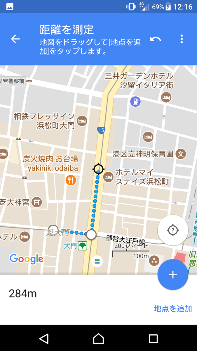 ▲地図をスクロールして、ターゲットを移動させる。前の地点からの距離は左下にリアルタイムで表示される。前の地点との距離を測りたい場所まで移動したら右下の<+>地点を追加をタップ。さらに距離を測りたい場合は、地図をスクロールしていく