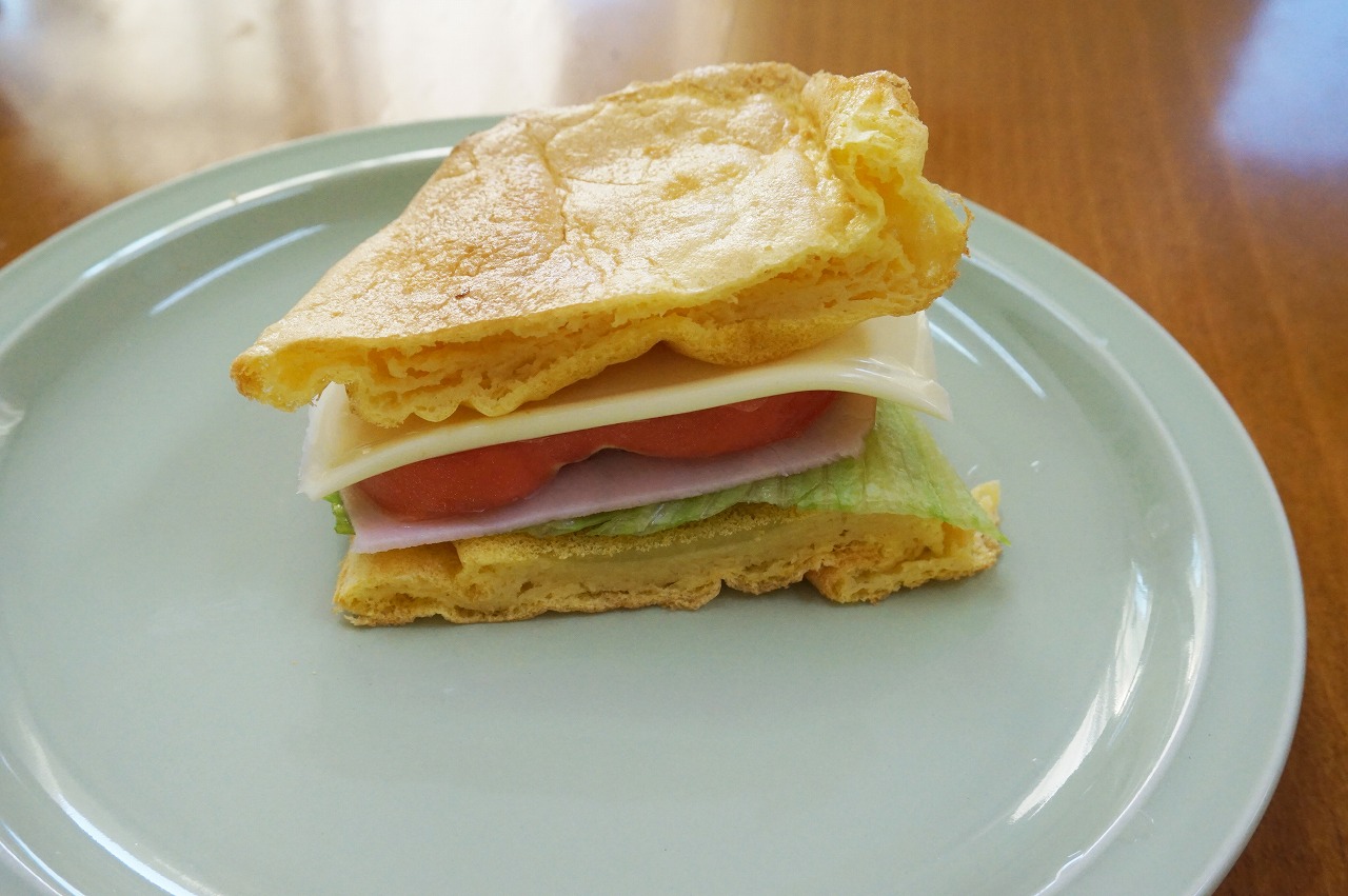 ハム、レタス、チーズ、トマトを挟んで、サンドイッチに! パンの代わりに使えば、糖質OFFで安心して食べられます。具材の味をまったく邪魔しないので、何を挟んでも合いそうです。