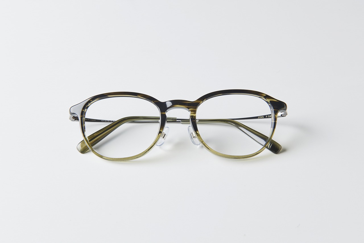 ▲JINSの鯖江モデルのメガネ。セルのフレームは、黒に対してカーキがグラデーションで入っている。柄の部分はメタル素材。セル×メタルの異なる素材のコンビネーションがアクセントになっている