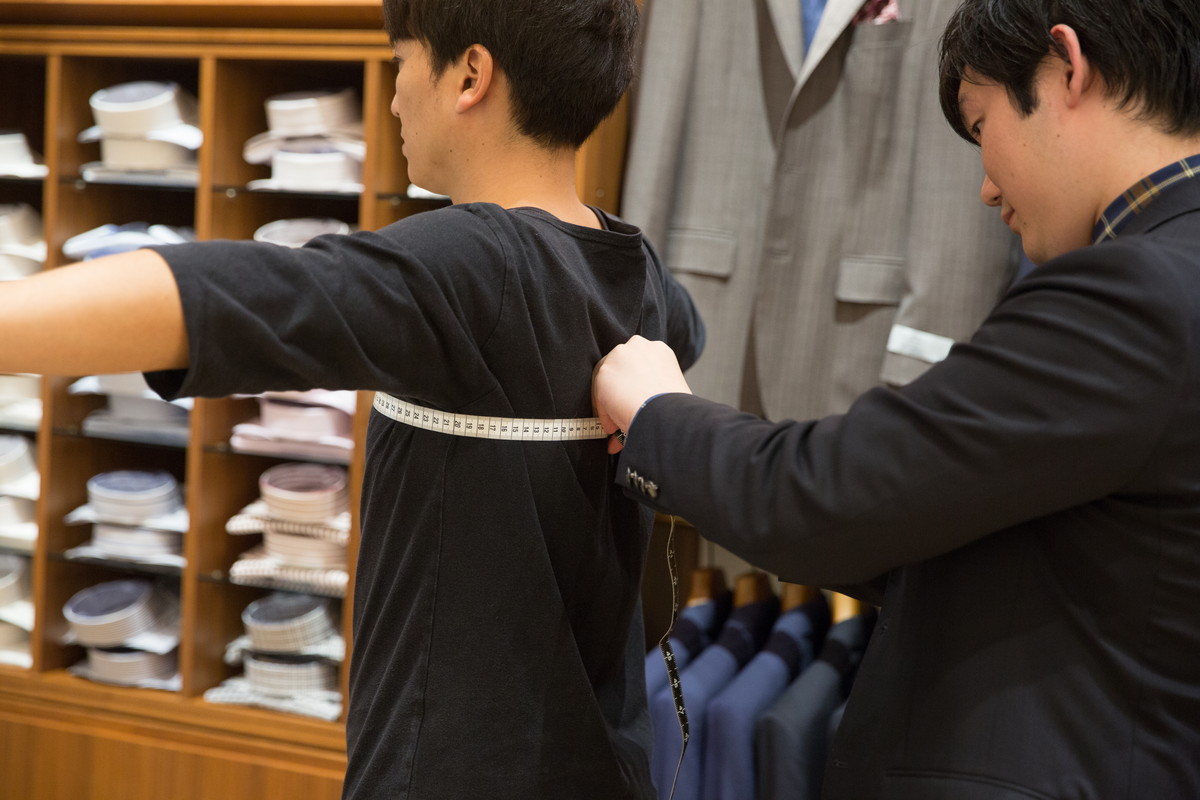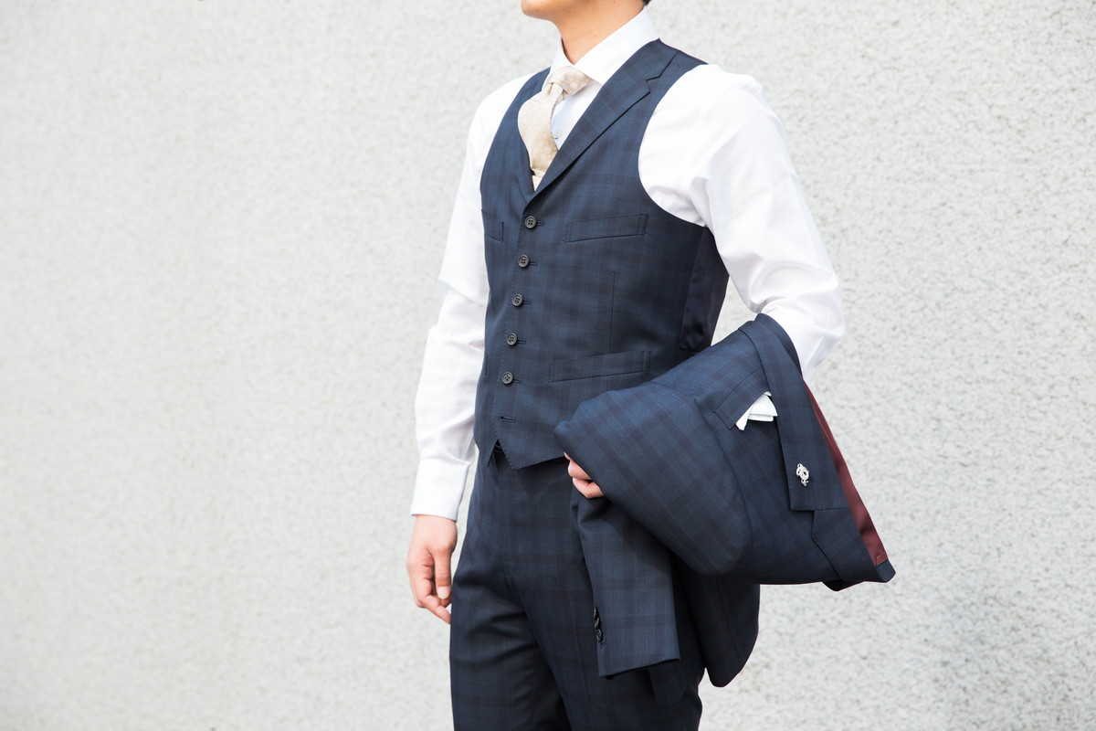このほか背抜きや襟のステッチ、ベントの位置など、さまざまなディテールを自分好みにアレンジできます。オプションとして追加料金がプラスされる仕様もあるので、オーダー時に確認しながら進めていきます。今回筆者は、結婚式の2次会での着用も見据えて、ベストを追加して3ピースにすることに!