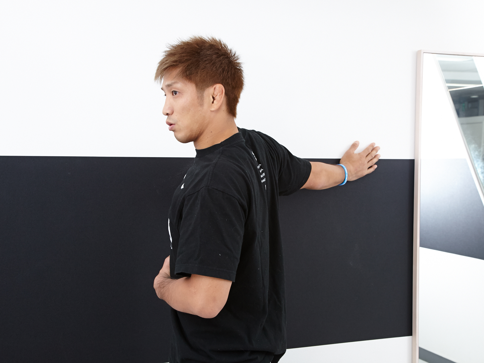 こちらは肩から胸・背中と上半身の広い範囲に効くストレッチです。やり方は簡単で、壁に手をついて身体をねじるようにして、胸を開きます。見て分かるように、どこでもすぐに、簡単にできますが、ストレッチ効果はけっこう高いです。