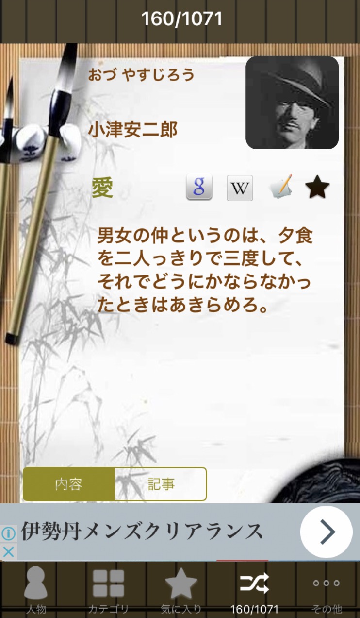 職場によっては、朝礼で持ち回りのスピーチを課せられているところなんかもありますね。ちょっと格調高くキメたくても、ネタ探しに苦労している人もいるのでは? そんなあなたは、この休みの間に国内外の名言・格言をたっぷり仕入れておきましょう。人物・カテゴリで探すこともできますし、ワンクリックでその人物についてのウィキペディアを閲覧できるのも便利。4択のテストもあるので、ヒマつぶしにも最適です。