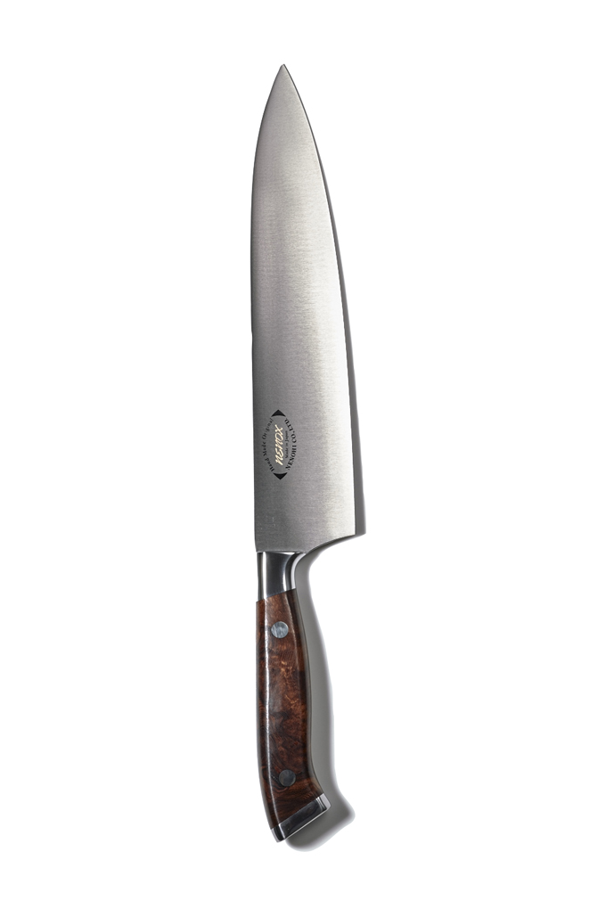 料理人から絶大な支持を受ける和洋包丁をそろえる包丁専門店の、シンプルなデザインの1丁。V1号鋼を使った全鋼製で、硬度が高いのが特徴です。切れ味は鮮やかで、長持ちします。