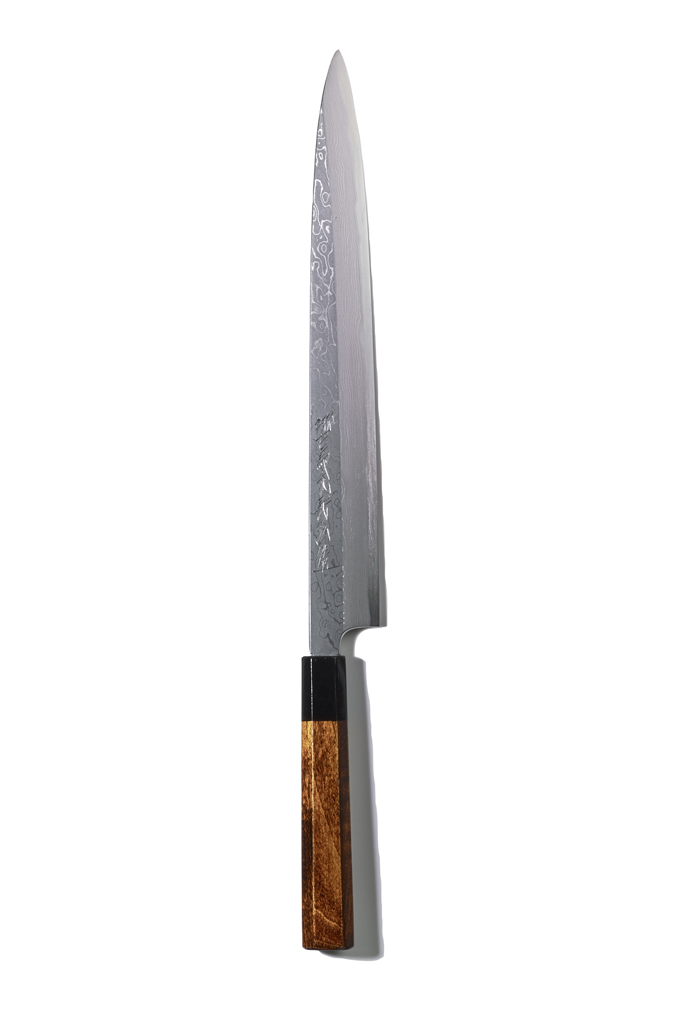 柳刃包丁の先端を落とし、厚みと重量を持たせた刺身包丁です。魚だけでなく、野菜のせん切りなどもこなせるよう、刃渡りは長く用途は幅広い包丁です。