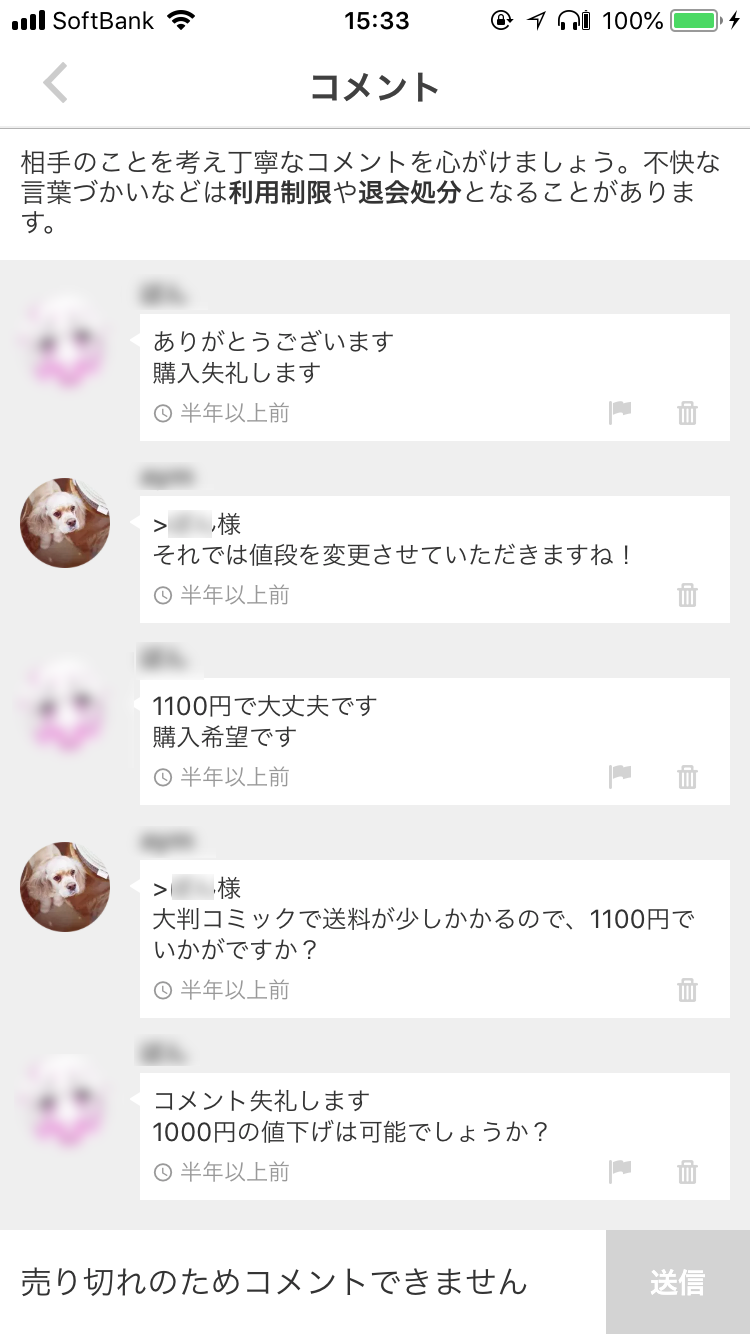 また、メルカリではコメント欄で値下げを求めて来る人がかなり多くいます。最初の頃は値下げに応じる必要はないと思いますが、1週間経っても売れないのであれば、値下げを提示して来たユーザーに応じてもいいかもしれません。