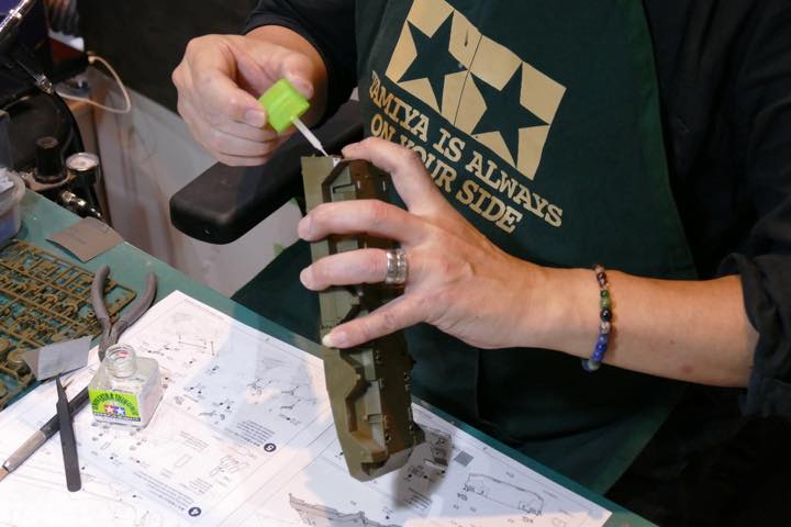 接着剤は、タミヤセメント(流し込みタイプ)を使用。旧来からの接着剤に比べて粘度が低い。毛細管現象を利用して、密着させておいたパーツの合わせ目に流し込むように塗布するタイプの接着剤だ。「しっかり固定できて、しかも乾燥時間が早い。接着はほぼ流し込みタイプで十分まかなえます。ただし、重量が掛かるような部位は旧来の粘度の高い接着剤を使うといいでしょう」(長谷川さん)