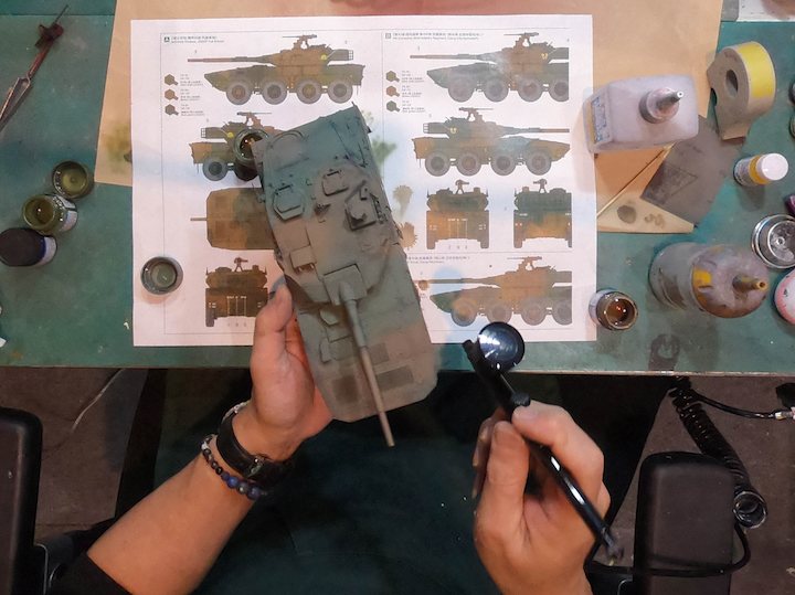 16式機動戦闘車に関しては、陸上自衛隊車両の標準的な迷彩塗装が採用されている。今回はそんな16式機動戦闘車の迷彩塗装をエアブラシとタミヤの新ラッカー塗料組み合わせで再現してみよう。