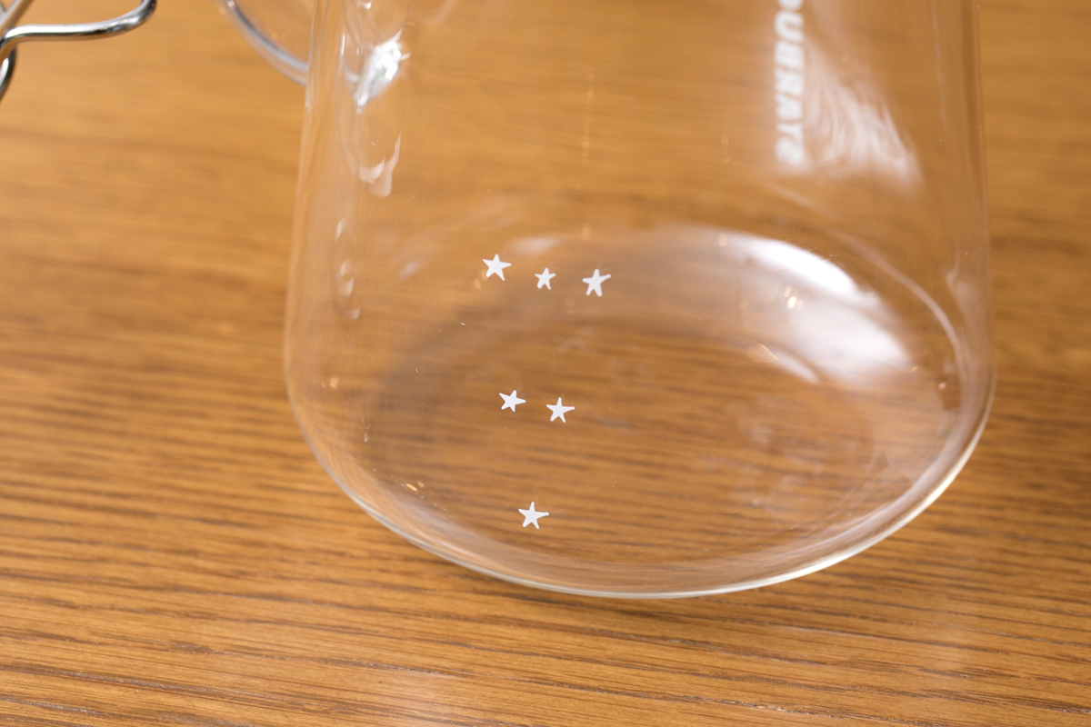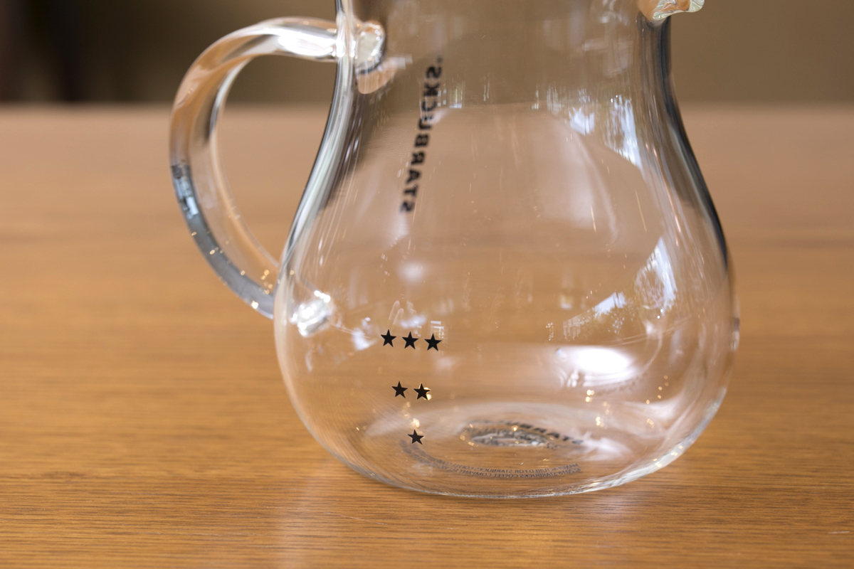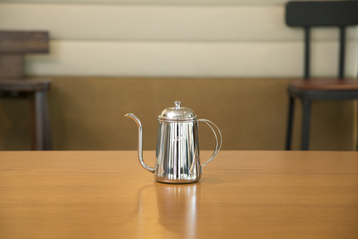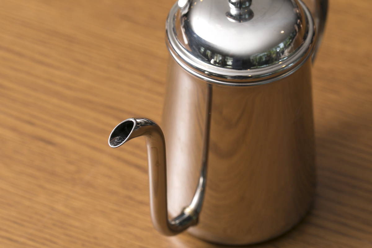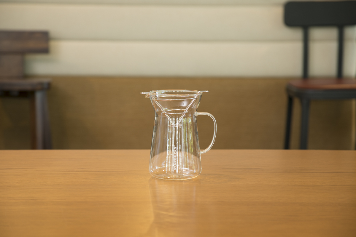 コーヒーをドリップする際に使用するドリップケトル。ドリッパーにお湯を落とす際の基本“細く、そして小さく円を描くように”がやりやすくなります。またドリップ時のお湯の温度は、スターバックスの推奨は90~96℃。ヤカンや電気ケトルで沸かしたお湯をこのポットに移すと、ちょうどこのぐらいの温度まで下がってくれるので、温度の目安にもなります。