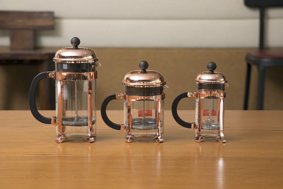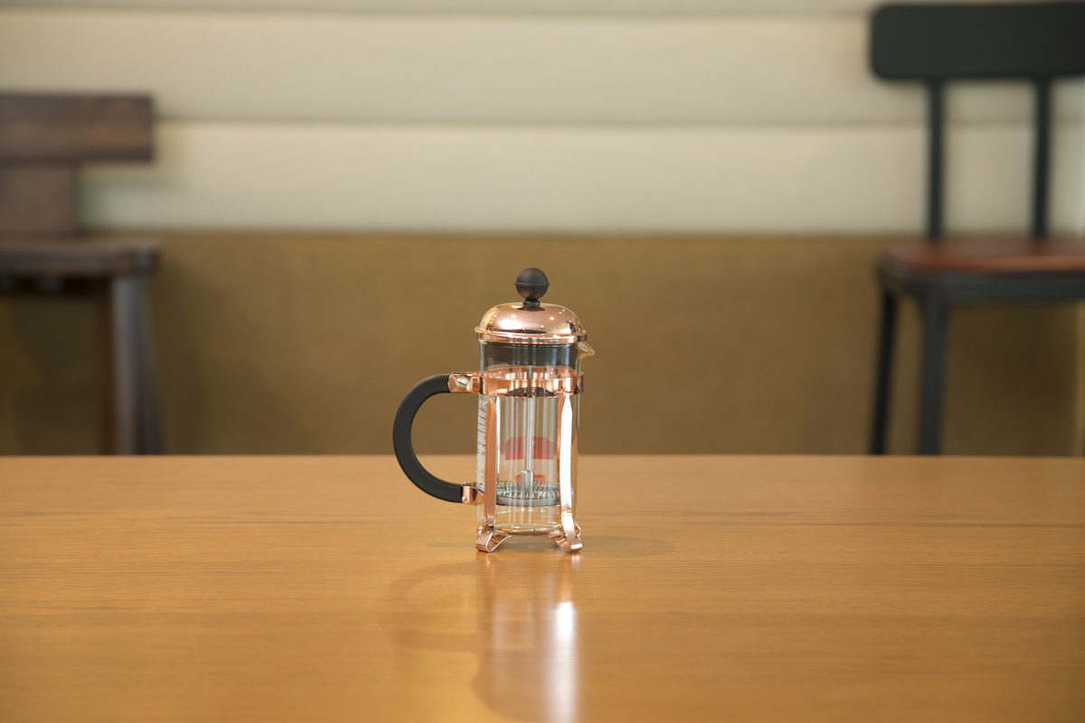 粗挽きのコーヒーをお湯に浸してじっくりと抽出する“コーヒープレス”用の抽出器具。最後の仕上げに入れたコーヒーを上から押さえて(プレスして)、注ぐ際に粉が出ないようにすることからコーヒープレスと言います。この仕組みは、まさにコールドブリュー コーヒーにもぴったり。中に粉を入れ、水をくわえて冷やせばOK。最後はコーヒーを押さえてグラスに注ぎましょう。