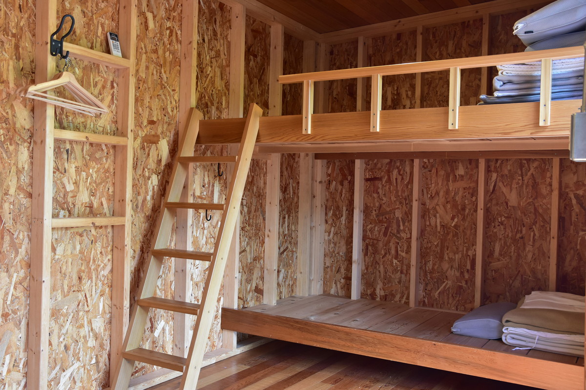 ▲荷物が散らかりがちなコテージ内で、就寝エリアを確保できるベッドは、あると快適!