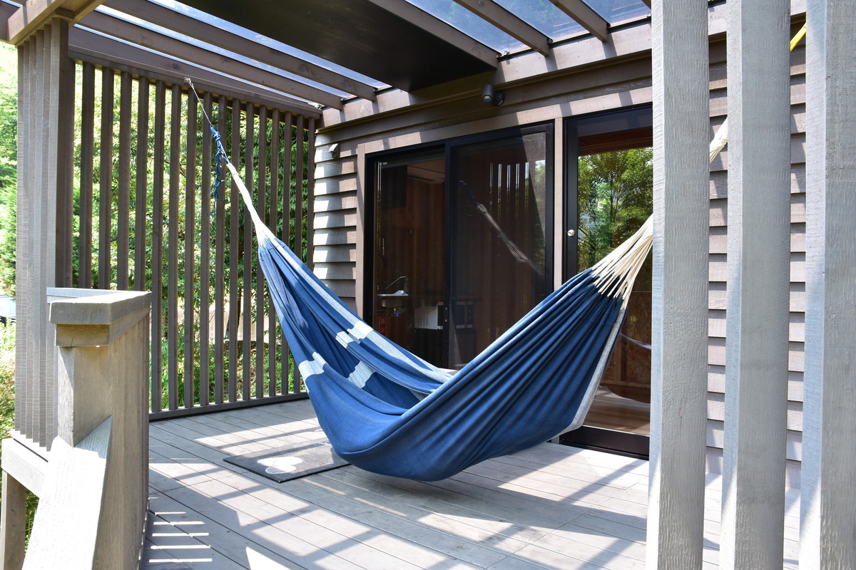 ▲テーブルを広げて食事を楽しんだり、ハンモックも吊せる広めのテラス