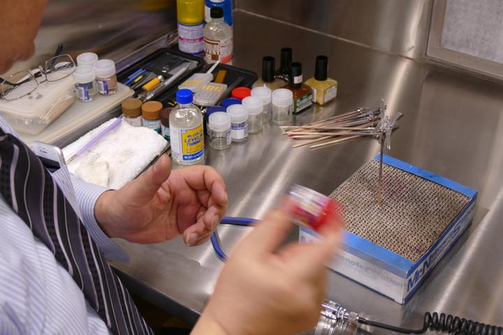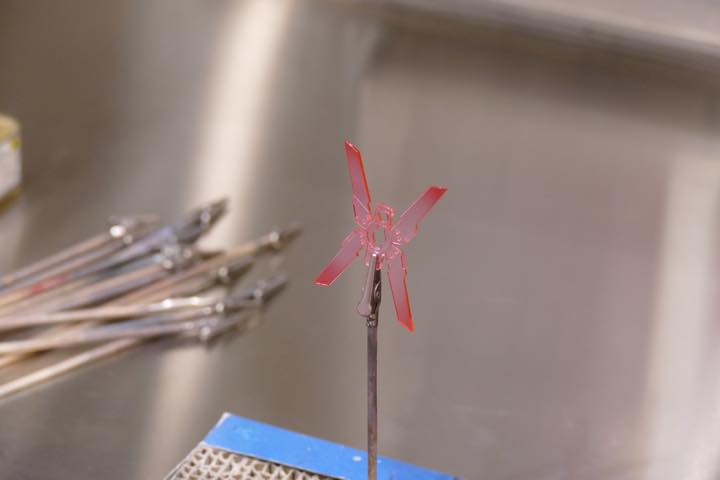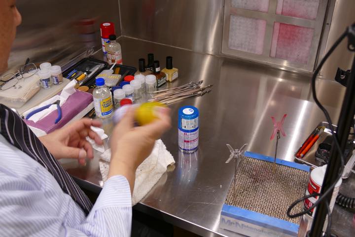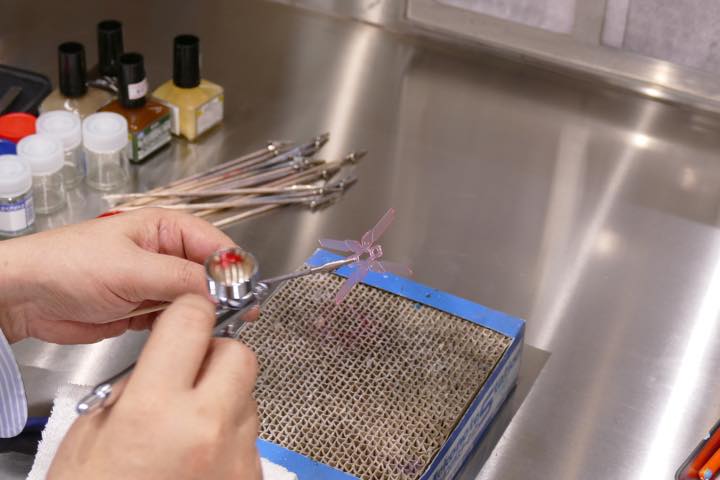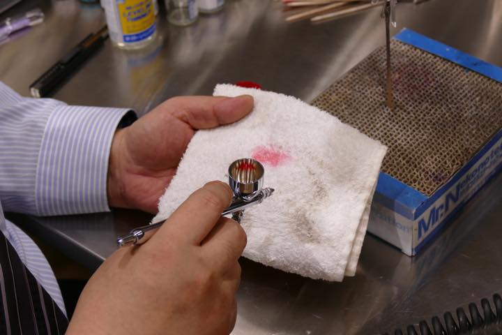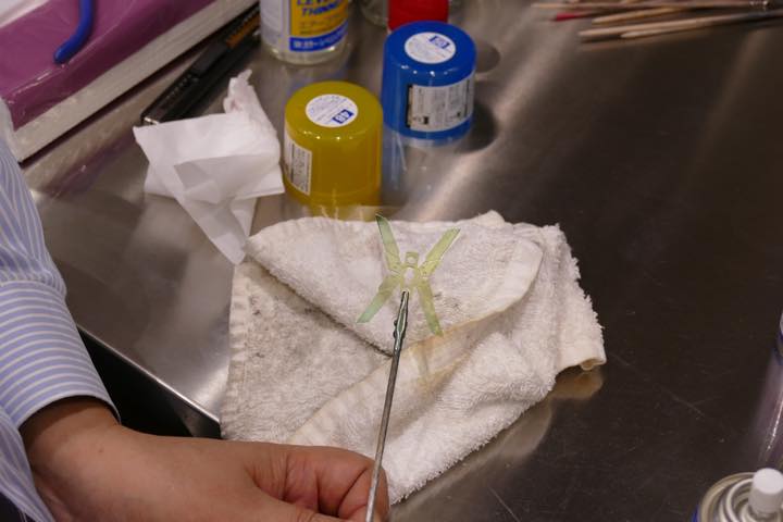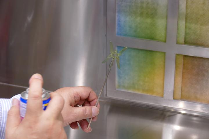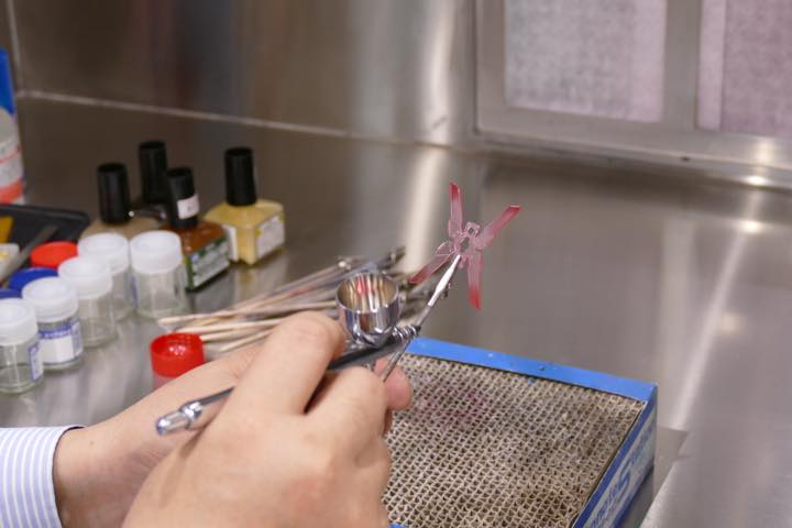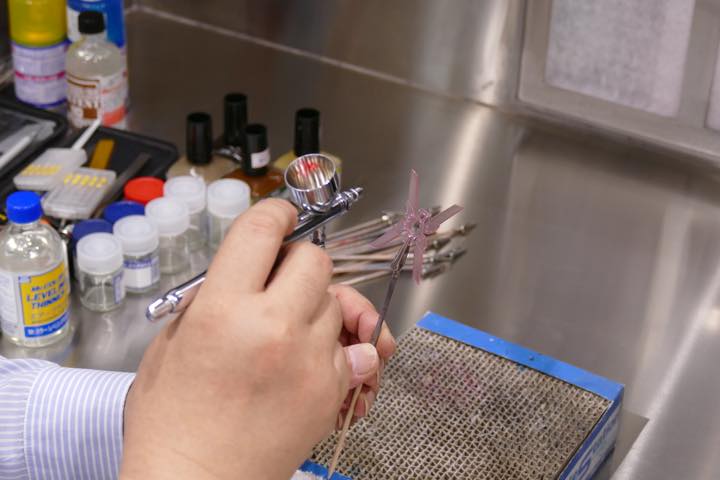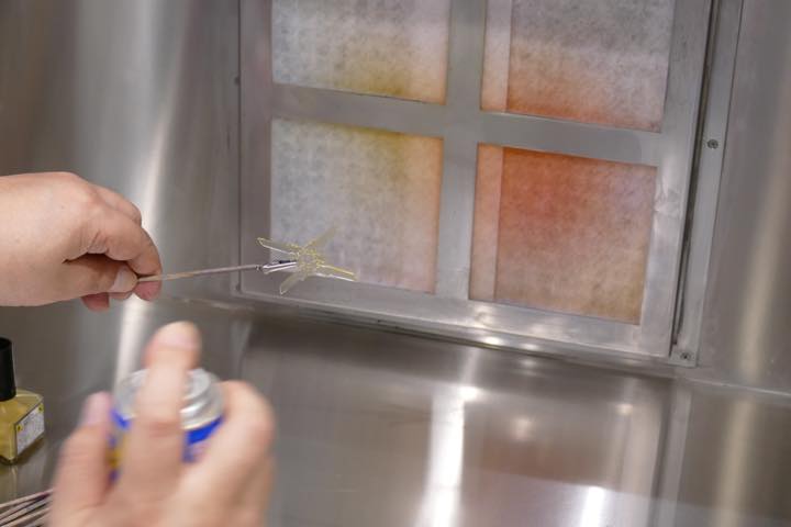 豊富な塗料が使えるエアブラシとは異なり、缶スプレーには用意されていない色がある。例えば、緑の缶スプレーはないが「“黄”と“青”を掛け合わせればいいんです」と川口さん。エアブラシの時に比べて着色するパーツをやや離した状態で、最初に黄色を軽く吹く。