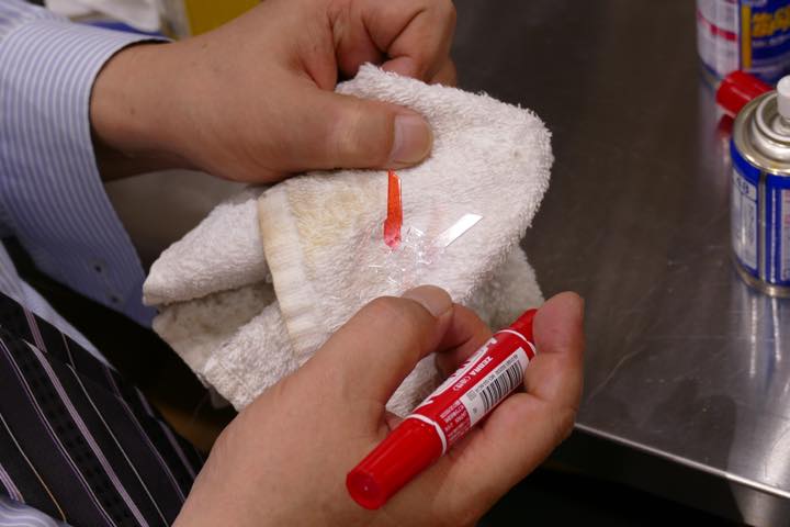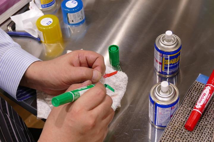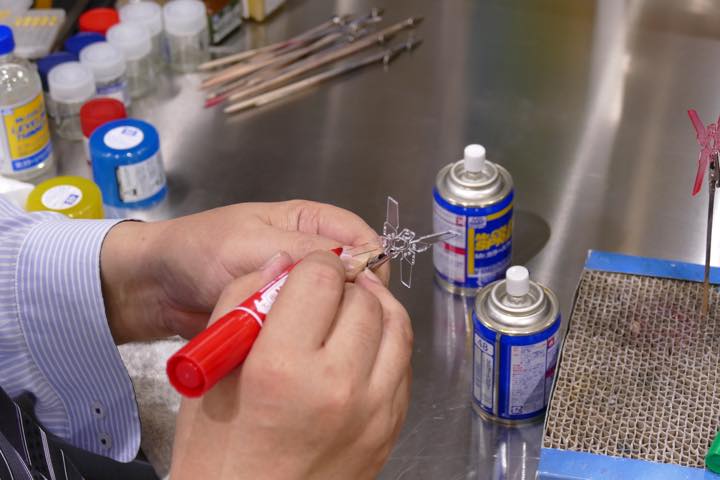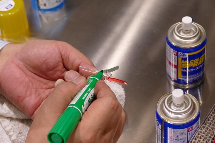 クリアパーツを塗装できる道具は、エアブラシや缶スプレーだけに限らない。油性マーカーでも十分にペイントできる。「表面に凸凹があると溝の奥まで塗るのが難しく、濃淡の加減はつけられないのですが、平面に好きな色を塗る点では問題ありません。手軽に入手できて誰にも使える安心感は、ほかの道具にはない利点です」(川口名人)