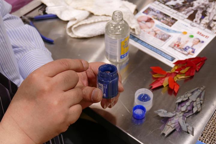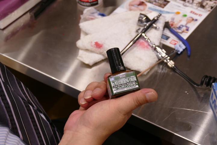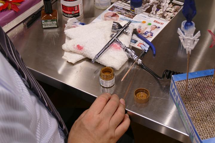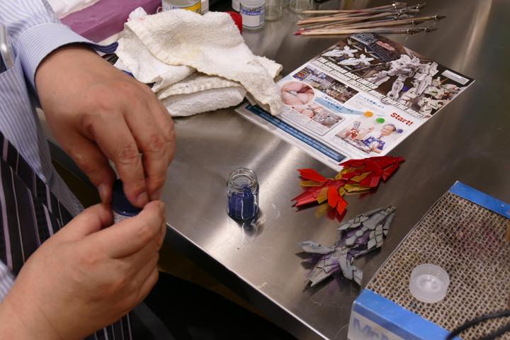 下地として青をペイントしたパーツを乾かしている間に、その上に塗る塗料を準備。下地のラッカー系塗料が溶けたり剥がれたりしないよう、GSIクレオス「水性ホビーカラー」シリーズのような水性塗装を使う。「最近では、プラモデルのウェザリング用に、さまざまな塗料が用意されています。GSIクレオスが展開している「Mr.ウェザリングカラー」シリーズもそのひとつ。あらかじめ希釈されていて、面相筆などですぐに使えるんです」(川口名人)