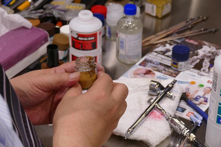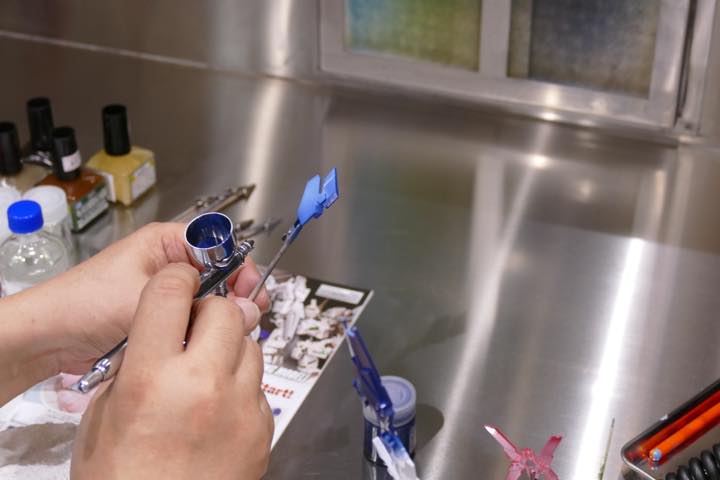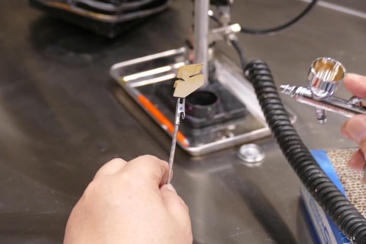 まんべんなくペイントできたら上塗りは完了だ。なお、冒頭にも触れたように、塗装が終わったら、エアブラシの塗料カップをしっかり洗浄しておこう。「上塗りに使ったのは水性塗料なので、乾く前なら水洗いでも落とせます。けれど、道具を長く使うことを考えれば、専用のクリーニング溶剤で、塗料をきれいにしておきましょう」(川口名人)