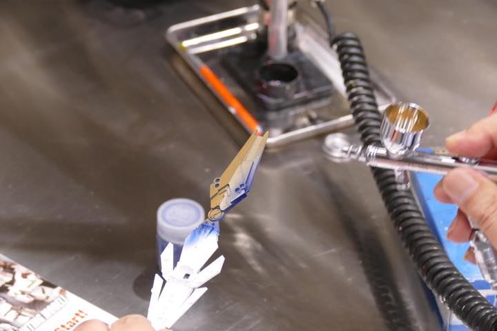 10分程度乾かした下地塗装済みのパーツにエアブラシでペイント。基本的には下地をすべて覆うように塗装していくが、パーツの隅まで厳密に上塗りする必要はない。「この後の工程で細かいところは別途塗るので、この段階では下地の青が隅に残っていても大丈夫です」(川口名人)