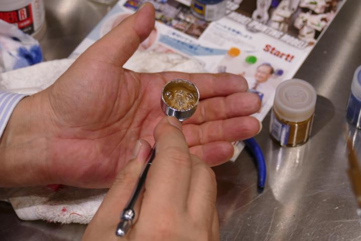 まずは「水性ホビーカラー」を、ラッカー系塗料と同様に小瓶で希釈する。この際にも、あくまでも“シャバシャバ”に薄めるのがポイントだ。とにかく塗料を薄くすることで、予期せぬ塗りすぎを防ぐことにつながる。「不慣れな人は“これで大丈夫なの?”と不安を抱かれるかもしれませんが、塗り重ねることで濃くできるので問題ありません」(川口名人)