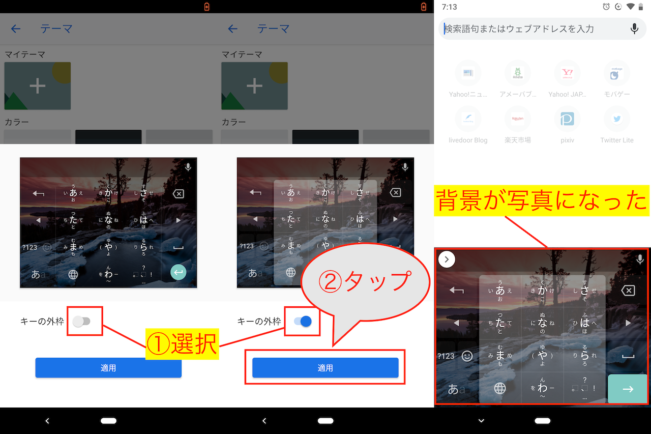 ▲「キーの外枠」は任意でオン・オフを選び、「適用」をタップ。これでキーボードの背景が写真になった