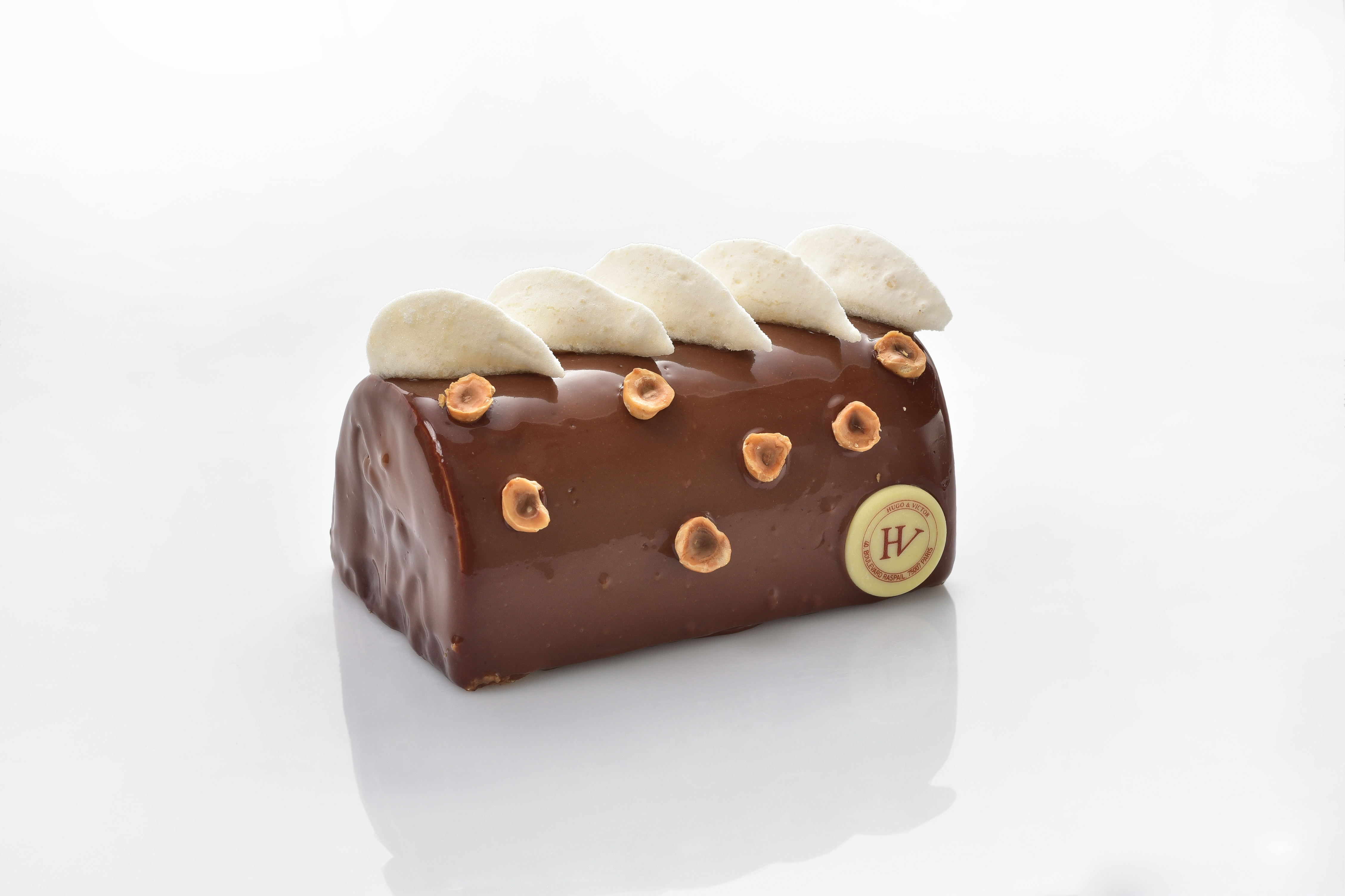 映画『終電車』のカトリーヌ・ドヌーブをイメージした「ビュッシュ・マリオン」は、香ばしさ際立つヘーゼルナッツムースとクレモンティーヌ(オレンジの一種)のピールを忍ばせたフィナンシェ生地、サクサクのフィユティーヌ入りプラリネ、水出しコーヒーのふわっとしたクレームシャンティなどを組み合わせた大人仕様の一品だ。