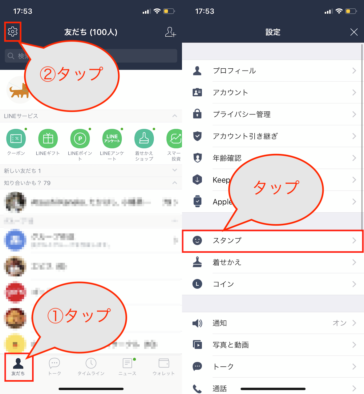 ▲「友だち」タブを選択し、画面左上にある「設定」アイコンをタップ。設定メニュー一覧から「スタンプ」をタップする