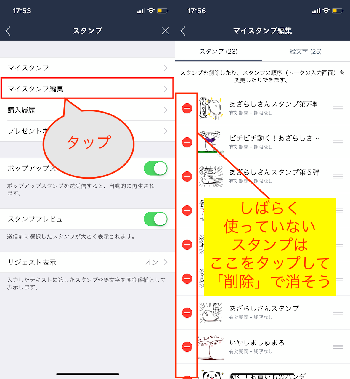 ▲「マイスタンプ編集」をタップすると、ダウンロードしているスタンプの一覧が表示される。使っていないスタンプは「-」>「削除」をタップして、この時点で断捨離しよう