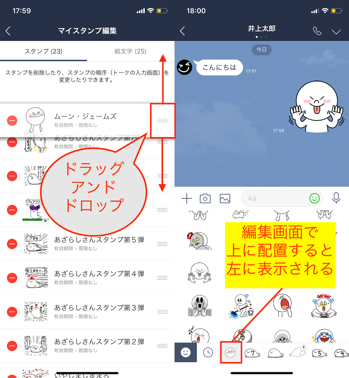 ▲マイスタンプ編集画面で「≡」をドラッグすると上下の順番が入れ替わる。その順番を反映してトークのスタンプ画面の並びが変わる