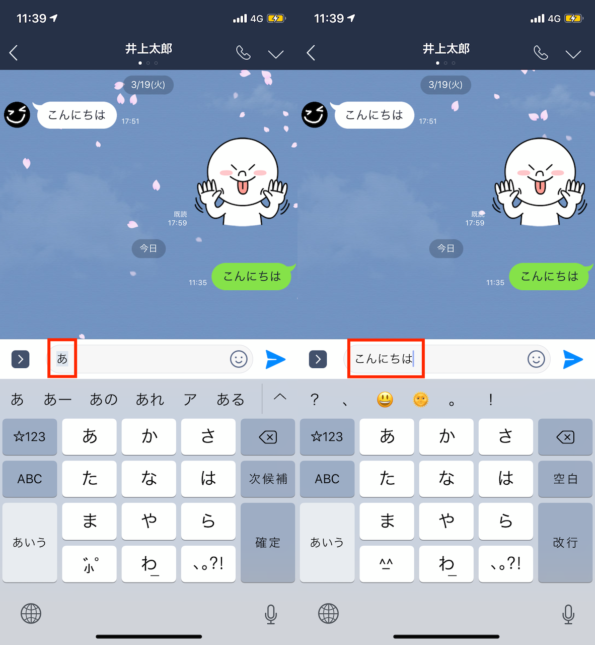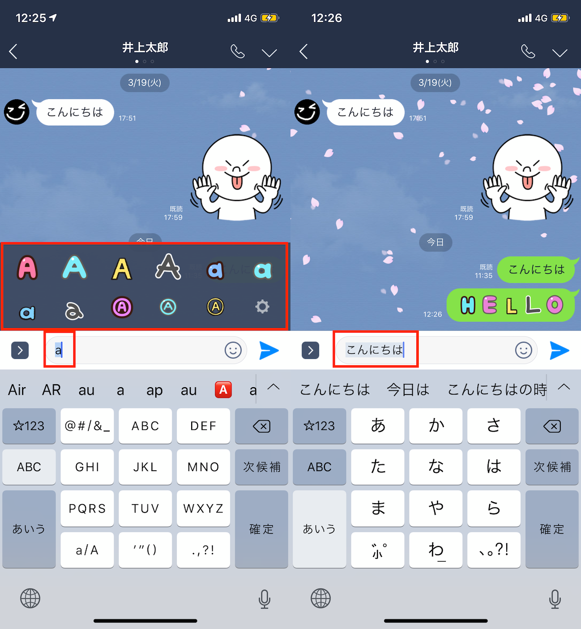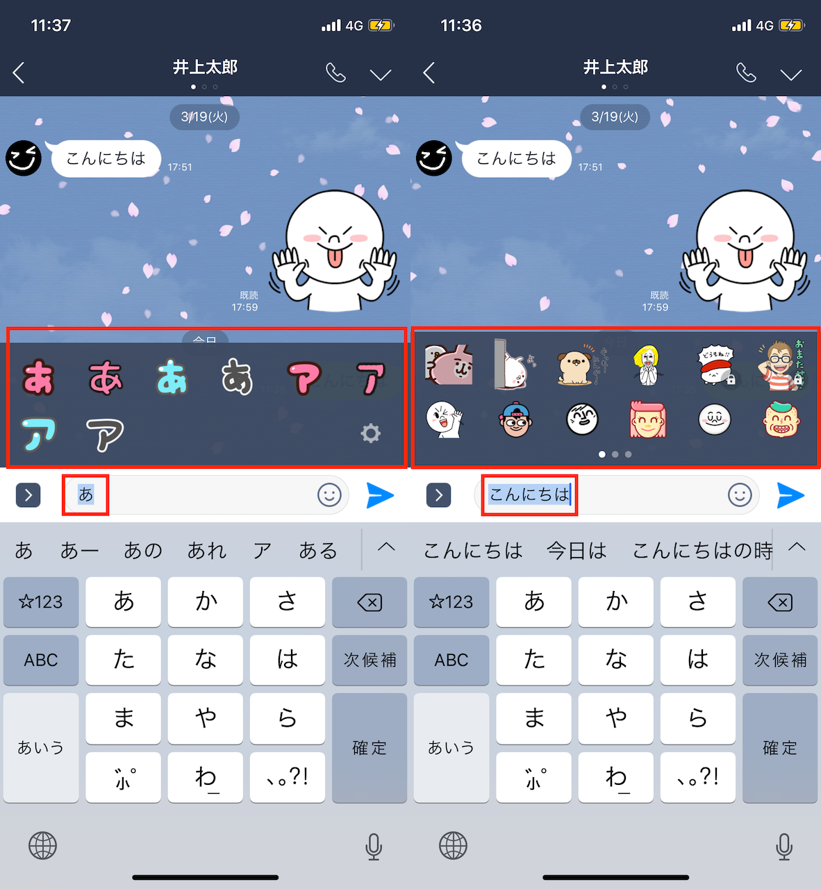▲「あ」と入力して絵文字スタンプの候補が表示された画面(左)と、「こんにちは」と入力してスタンプと絵文字の候補が表示された画面(右)