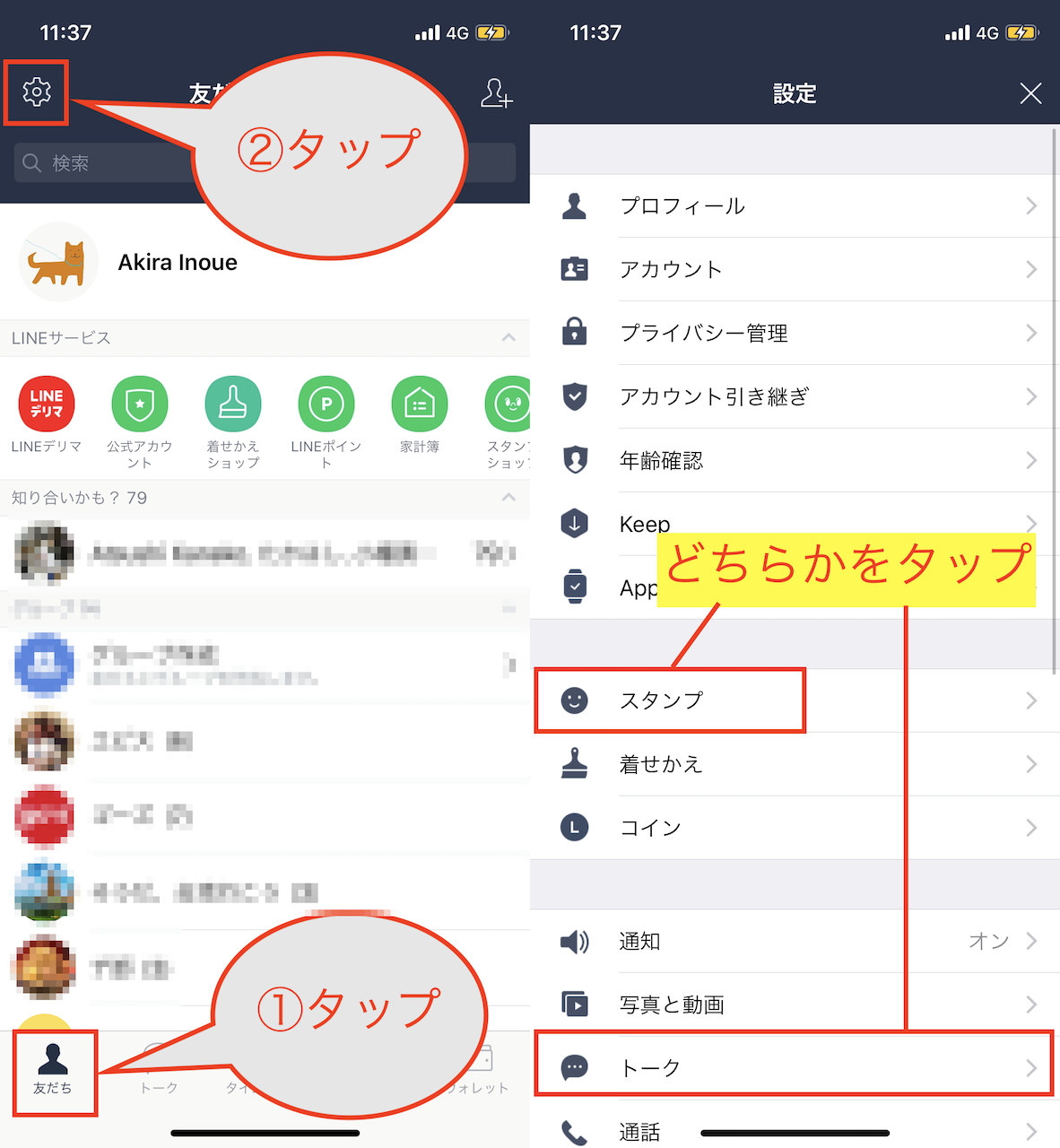 ▲「友だち」タブにある設定アイコンをタップ。「設定」画面で「スタンプ」または「トーク」をタップする