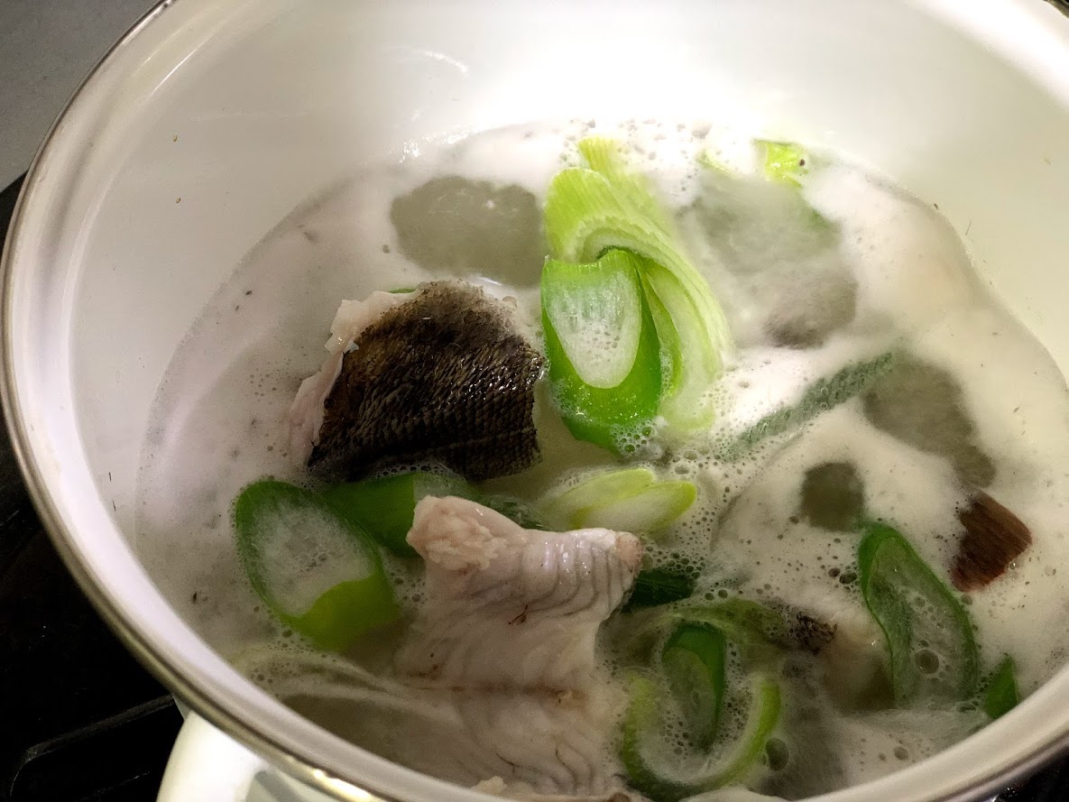さて、釣った魚は最後まで面倒みるということで、担当編集が釣った分も頂いてレッツ・クッキング。まずはカサゴとソイですが、頭とウロコを落とし、ぶつ切りにした身を煮てそのままお味噌汁にしました。