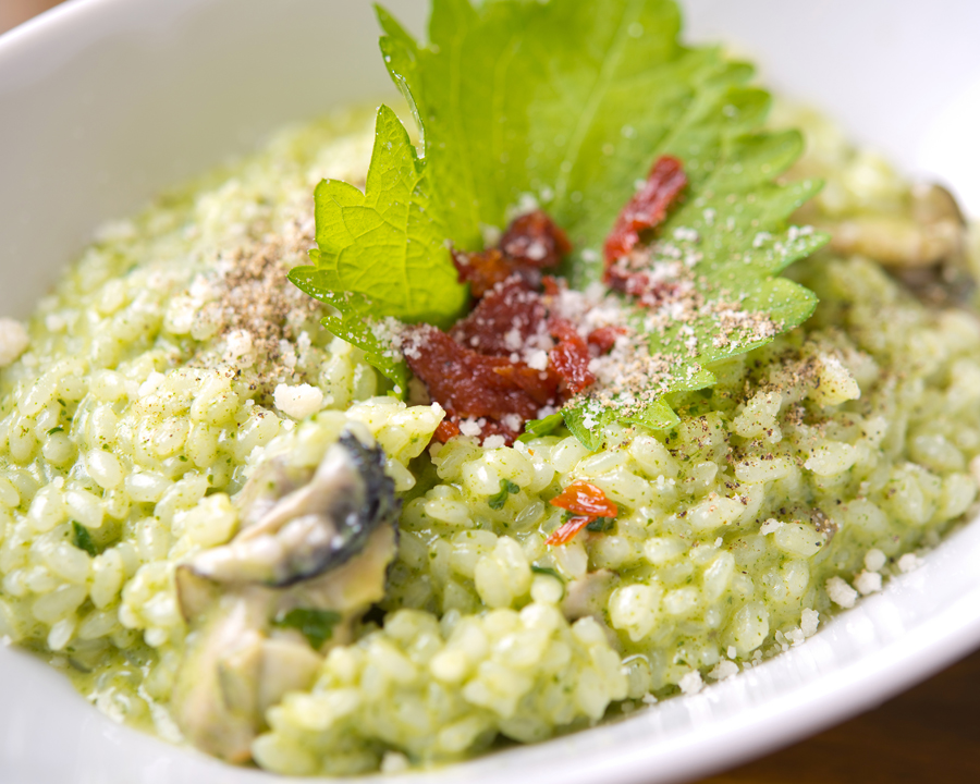 飲みの〆に注文マストな「牡蠣と大葉のリゾット」1580円