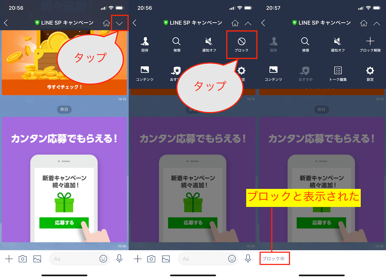 こうした場合には、そのトークをブロックしておきましょう。これで以降のメッセージが届かなくなります。トーク画面を開き、画面右上の「∨」から「ブロック」を選択すればOK。ちなみにブロックを解除するには、「設定」>「友だち」>「ブロックリスト」>「編集」>「ブロック解除」と操作しますので、合わせて覚えておきましょう。