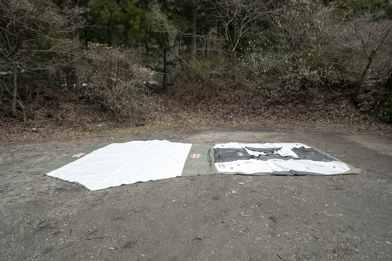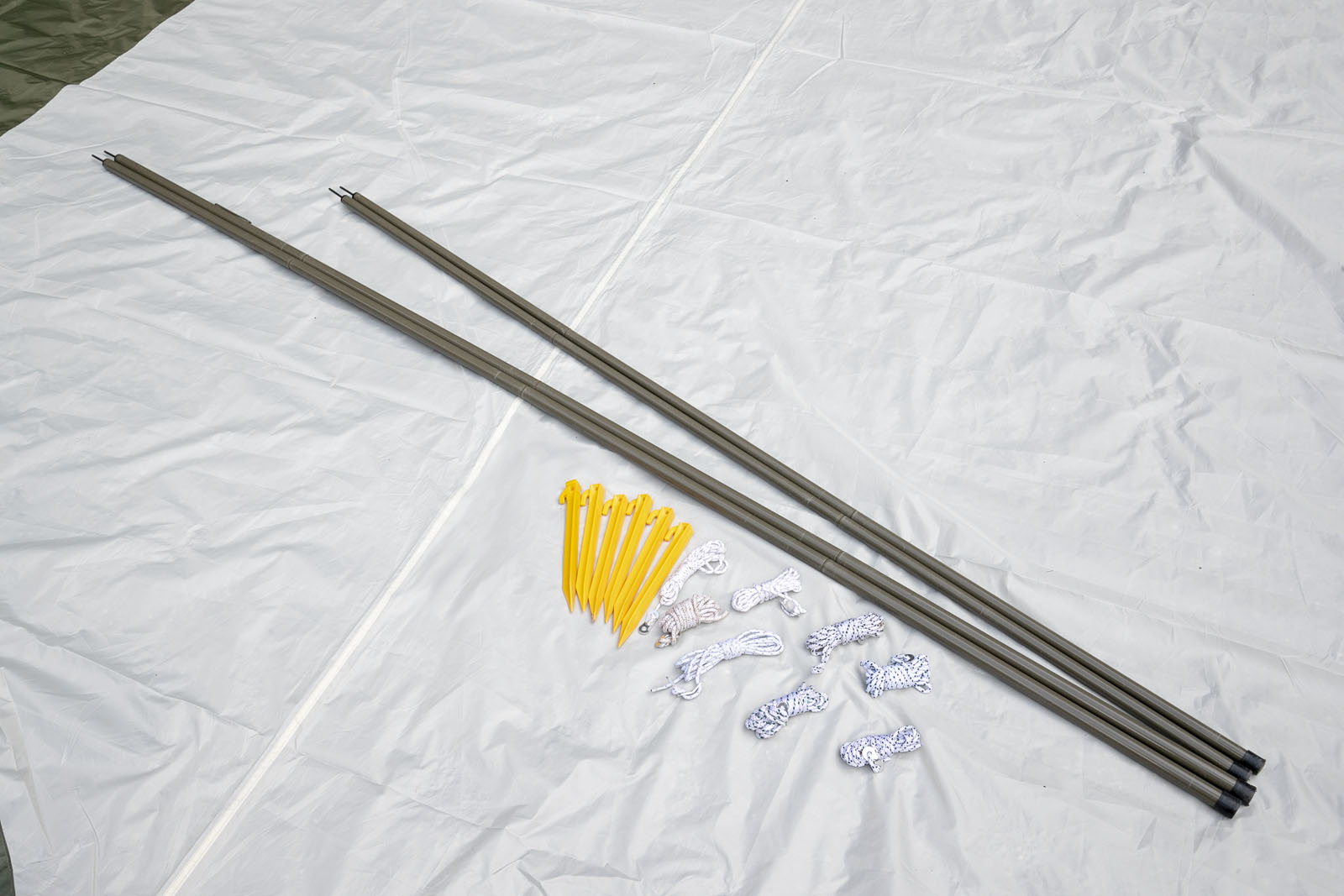 2本のメインポールを立ち上げます。片側のメインポールを立ち上げたら、タープ本体を引っ張るようにしてもう片方を立ち上げ、張り綱を調整すると簡単にできます。